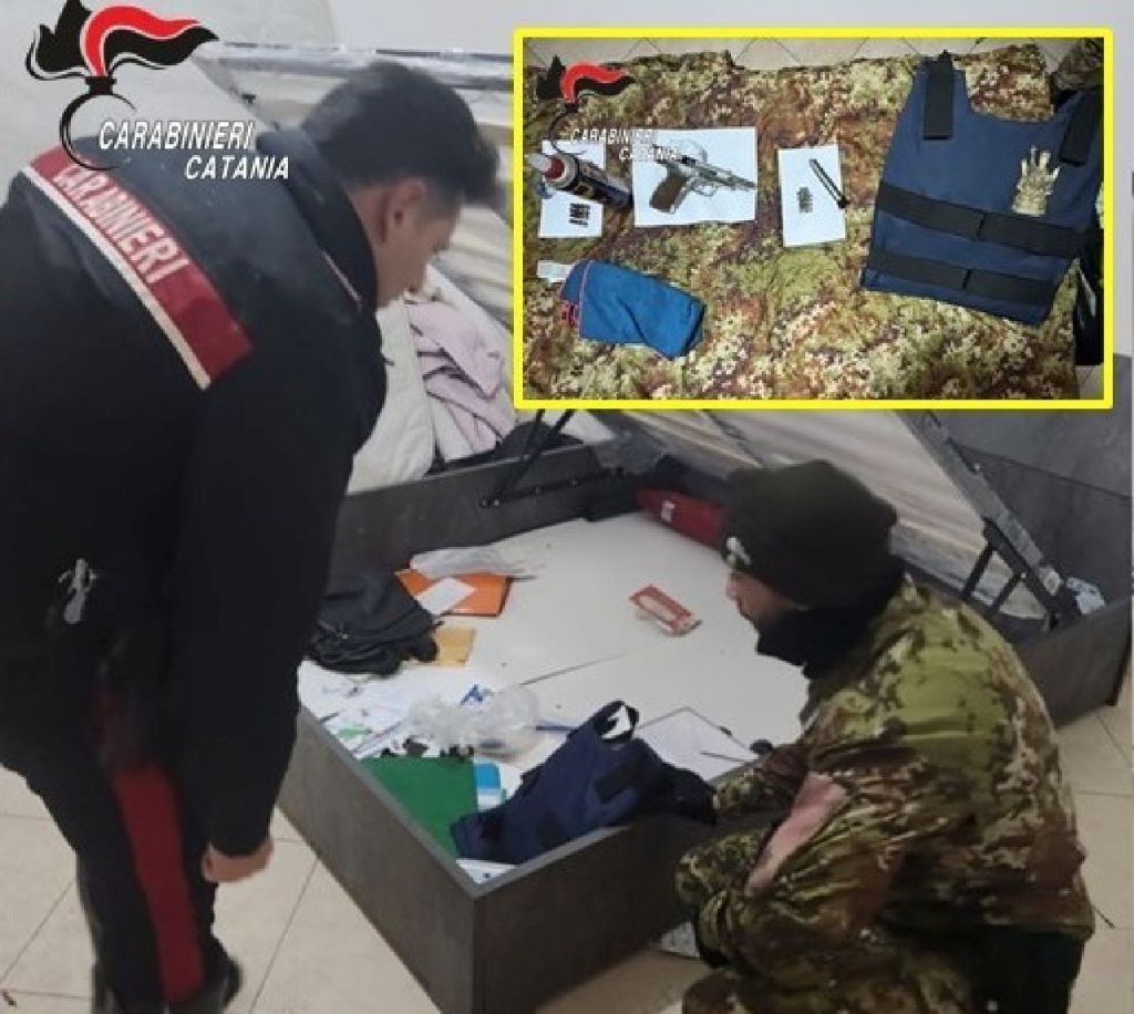 I militari, ingaggiando col il fuggitivo un inseguimento lungo i tetti dei palazzi, sono così riusciti a raggiungerlo dopo alcune decine di metri, mentre nello stesso momento, gli altri colleghi sono stati in grado di recuperare, tra la fitta vegetazione, il borsello che l’uomo aveva gettato via durante la fuga. Al suo interno, una pistola semiautomatica Tanfoglio cal. 9×21, con matricola abrasa e canna modificata per l’utilizzo di un silenziatore, munita di due caricatori con 28 colpi inseriti.