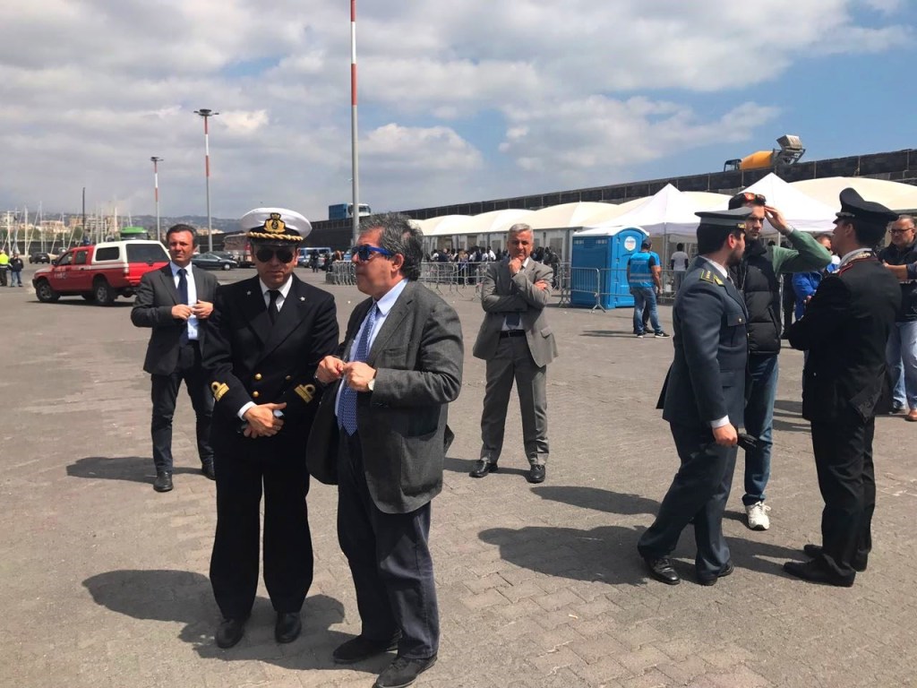 Il sindaco di Catania Enzo Bianco ha effettuato stamattina un nuovo sopralluogo nel Porto di Catania dove è attraccata la corvetta militare tedesca Tender A513 Rhein che aveva a bordo 1300 migranti tratti in salvo nel Canale di Sicilia nel corso di diverse operazioni di salvataggio.