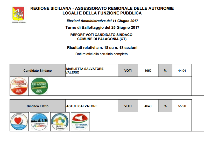 Dopo la conferma del mancato raggiungimento del quorum a Trapani che resterà, dunque ,senza sindaco, è Catania la prima provincia a completare lo scrutinio dei ballottaggi ed a proclamare i due sindaci eletti.