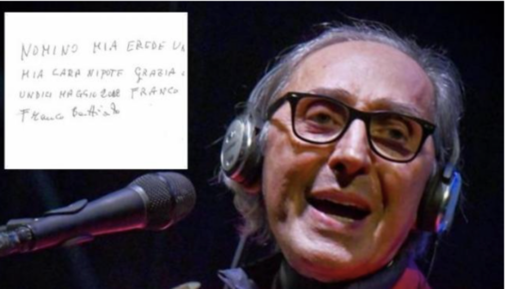 “Nomino come mia unica erede la mia cara nipote Grazia Cristina Battiato. 11 maggio 2018. Franco Battiato”. Tre righe, scritte in stampatello, e la sua firma. Si tratterebbe dell’ultimo scritto noto del cantante, ed è apparso un mese e mezzo dopo la sua morte il 30 giugno 2021, a Milano, nello studio del notaio ed avvocato Alessandro De Cicco. A portarglielo chiedendone la pubblicazione è stata proprio Grazia Cristina Battiato, beneficiaria di quel testamento.