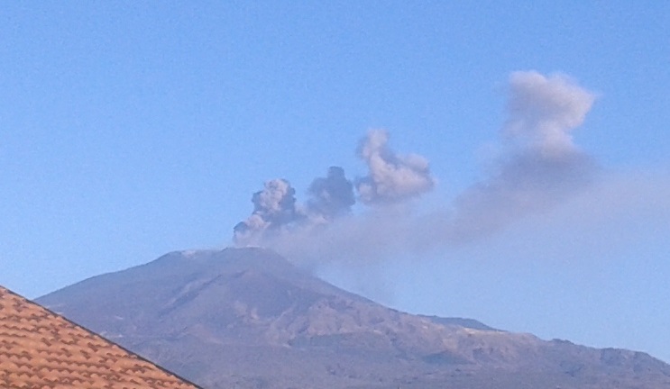 E continuano le sporadiche emissioni di cenere dalla bocca sul fianco orientale del cono del Nuovo Cratere di Sud-Est.