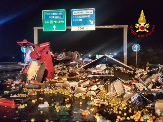La notte scorsa vigili del fuoco del distaccamento Nord del comando provinciale di Catania, supportati da personale Nbcr della sede centrale, sono intervenuti per un copiosa perdita di carburante da un Tir che trasportava frutta e verdura chi si è ribaltato sulla tangenziale di Catania al km 12, tra il bivio di Misterbianco e quello di Caltagirone in direzione Siracusa.