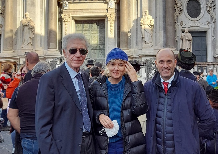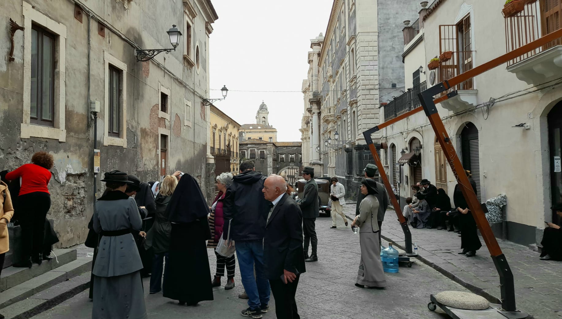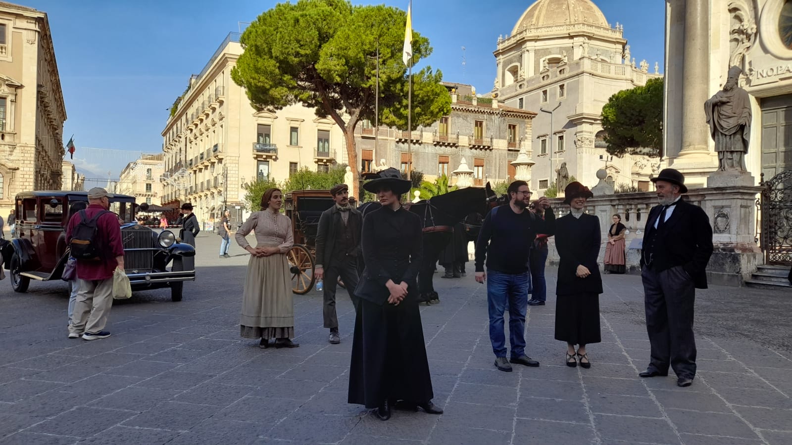 È un’inedita piazza Duomo “vestita” di Novecento a fare da cornice al saluto che la città di Catania, con il commissario straordinario Federico Portoghese, ha rivolto alla regista Valeria Golino sul set della serie televisiva “L’arte della gioia”, allestito di fronte al Palazzo di Città, tra la Cattedrale e porta Uzeda. Con oltre 100 figurazioni, donne e uomini in abiti d’epoca, automobili antiche, carrozze e cavalli.