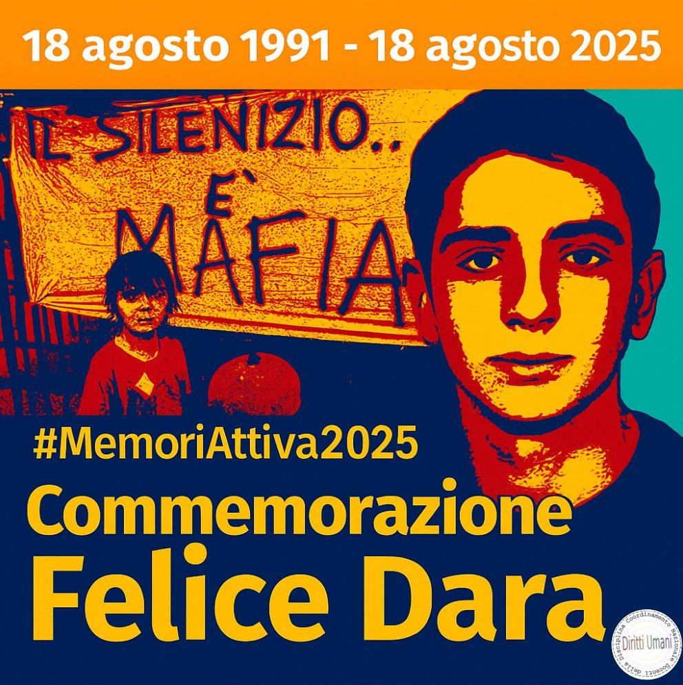 Il Coordinamento Nazionale Docenti della disciplina dei Diritti Umani, nel 34° anniversario dell’omicidio mafioso di Felice Dara, giovane di soli vent’anni assassinato il 18 agosto 1991 a Castellammare del Golfo (TP), intende ribadire con forza che la memoria delle vittime innocenti delle mafie non è solo un dovere civile, ma un compito educativo irrinunciabile per ogni scuola di ordine e grado.