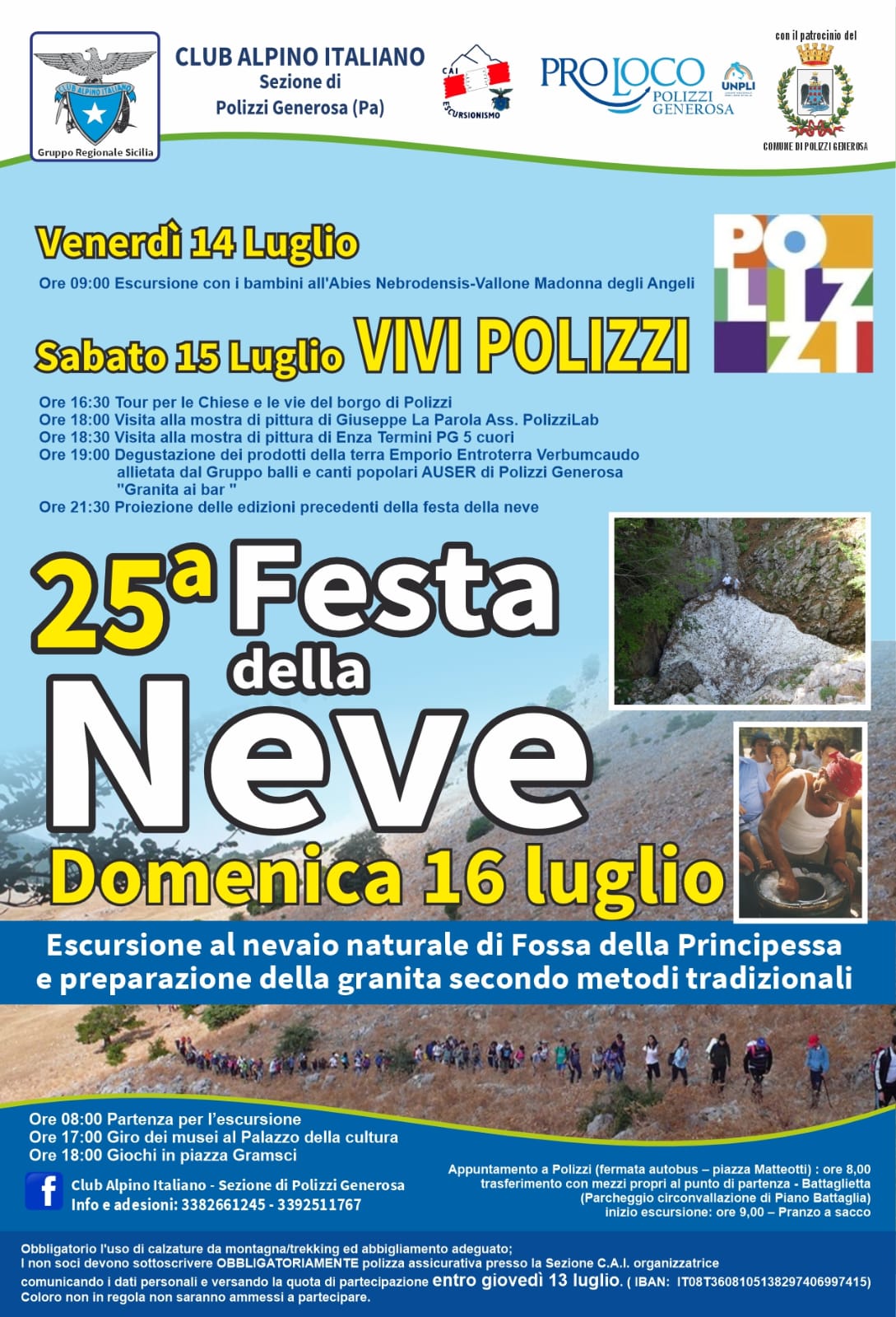 Durante la terza domenica di luglio, si svolge la “Festa della Neve”, che comprende un’escursione al nevaio naturale di Fossa della Principessa e la preparazione di granite utilizzando metodi naturali. Il CAI di Polizzi assieme alla ProLoco e il Comune ,quest’anno ha deciso di allargare le manifestazioni locali, in una programma già definito. Escursione tra la degustazione e deliziose granite a base di neve fresca delle Madonie.