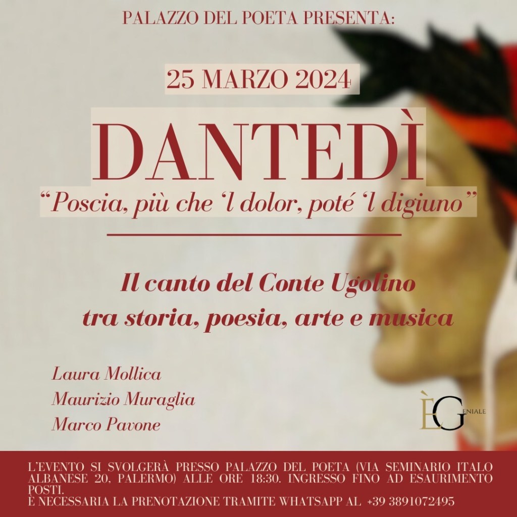Il 25 marzo ricorre il Dantedì, l’importante giornata nazionale dedicata a Dante Alighieri, (istituita nel 2020 dal Consiglio dei Ministri su proposta del ministro della Cultura Dario Franceschini). Il Dantedì richiama l’inizio presunto del viaggio di Dante nella Divina Commedia, avvenuto il 25 marzo 1300, quando il poeta si smarrì nella selva oscura. A “Palazzo del Poeta” di Palermo non poteva dunque mancare un evento dedicato al sommo scrittore e nello specifico sarà il conte Ugolino il protagonista dell’approfondimento a cura di: Laura Mollica, Maurizio Muraglia, Marco Pavone. Dante è sempre tra noi con le questioni che ha posto e che continua a porre. Oggi che la politica degenera sempre di più in acredine e rissa il personaggio dell’ Ugolino spiegato, Ugolino letto, Ugolino musicato, Ugolino rappresentato ne rappresenta appieno la contemporaneità.