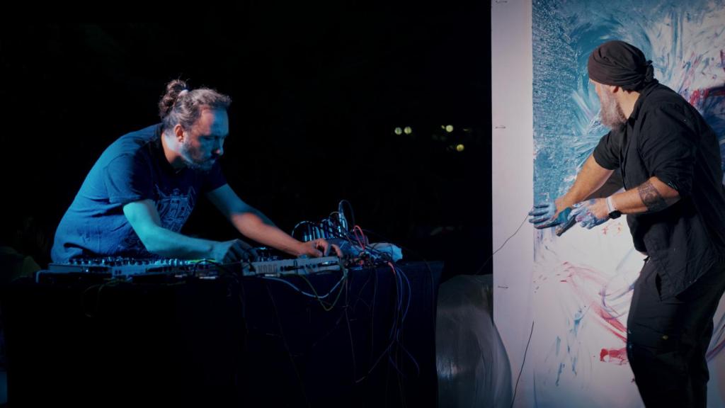 300grammi è una performance innovativa che combina pittura e musica per creare un’esperienza multisensoriale unica. Si chiama pittura sonora perché è una pittura che suona: ogni passaggio di Igor sulla tela, su una pala d’altare dedicata a Santa Rosalia, produce un suono che viene campionato dal vivo, filtrato e manipolato da Angelo in tempo reale e processato attraverso effetti sonori. Insieme, creano un quadro che diventa tessuto visivo e sonoro. Una costruzione estemporanea dell’immagine e della musica, assolutamente sincrona, in cui il suono non può fare a meno del gesto pittorico e viceversa.