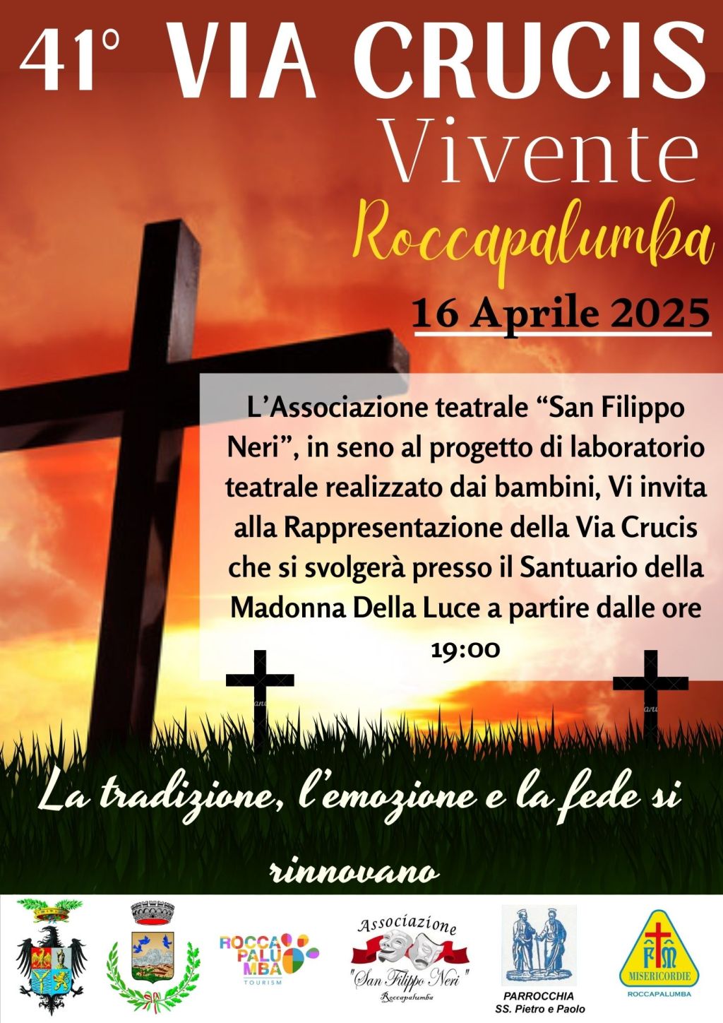 L’iniziativa è volta a mettere in scena la trasposizione della via Crucis vivente che ripercorre le tappe fondamentali della vita di Gesù dai  40 giorni di tentazione nel deserto fino al processo tra i saggi del sinedrio, Pilato e poi infine la Resurrezione. I luoghi caratteristici e naturali di Roccapalumba si prestano perfettamente all’ambientazione e regolano un palcoscenico suggestivo ed emozionante e cornice di una rappresentazione densa di momenti salienti e intensi. Le scenografie vengono allestite artigianalmente e la parte recitata viene curata da un gruppo di regia tecnica che si cimenta nella stesura del copione e nella resa della voce narrante e della parte recitata da ogni singolo personaggio.