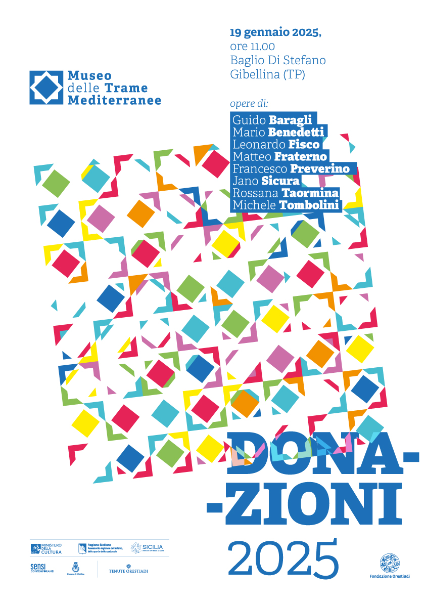 Otto artisti che appartengono a generazioni diverse, differenti ambiti delle arti visive e da diverse città italiane (Venezia, Terni, Napoli, Torino) oltre che dalla Sicilia, rappresentano insieme un interessante spaccato della produzione artistica contemporanea, mantenendo viva l’idea dell’arte come motore del rinnovamento. Una visione che ha animato la ricostruzione di Gibellina e la fondazione del Museo delle Trame Mediterranee trovando legami e conferme nella storia. Dalle opere in città di Consagra e Burri, da Paladino a Schifano e Accardi; dalle presenze di Beuys e Isozaki, al Cerchio della vita di Long, dai versi degli antichi poeti siculo-arabi a quelli dei contemporanei, da Adonis a Evtushenko, solo per citarne alcuni, per arrivare fino ai nostri giorni.