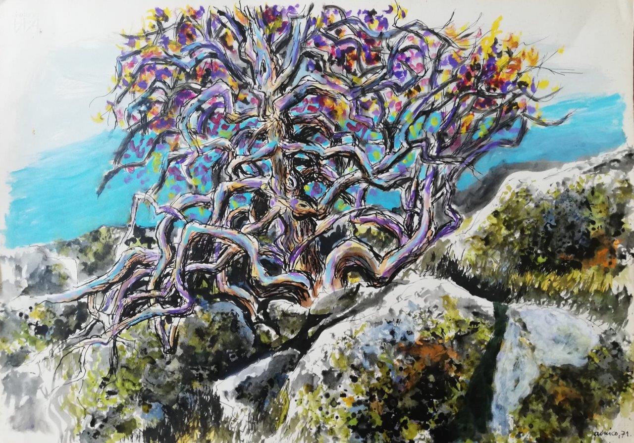 Totò Amico è stato per quasi quarant’anni il “pittore dei nisseni”. Gli inchiostri di china e gli acrilici su tela, raffiguranti nodosi e contorti tronchi di ulivi secolari e pistacchi, le agavi, i grovigli di rami e foglie. Le coppiette che amoreggiano imboscate, confondendosi in una trama intrigante di fogliame e cinguettii di uccelli svolazzanti. La mitica Fiat 500 trasformata in alcova al riparo di un albero per frettolose effusioni. La vita, la gioventù che esplode. I volti delle donne, dei giovani. L’opera di Totò Amico (1929- 2013) è stata più volte presentata, recensita e lodata da personaggi di spicco della cultura italiana quali Leonardo Sciascia (Galleria “Cavallotto” Caltanissetta, Galleria “Le Muse” Bologna, Galleria “Il Paladino” Palermo), Franco Grasso, Sebastiano Addamo (Mondadori).