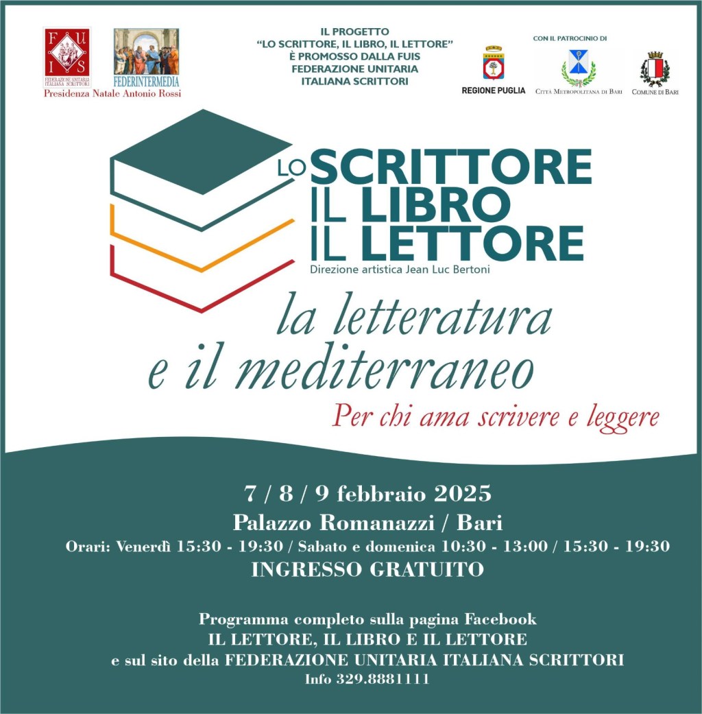 La Federazione Unitaria Italiana Scrittori (FUIS), con il patrocinio della Regione Puglia, della Città Metropolitana di Bari e del Comune di Bari, promuove l’edizione 2025 dell’evento “Lo Scrittore, il Libro, il Lettore”, che si terrà dal 7 al 9 febbraio 2025 nella prestigiosa cornice di Villa Romanazzi. Questa edizione sarà dedicata al tema “Il Mediterraneo”, una riflessione sull’identità culturale, le tradizioni e le connessioni che legano i popoli attraverso la letteratura.