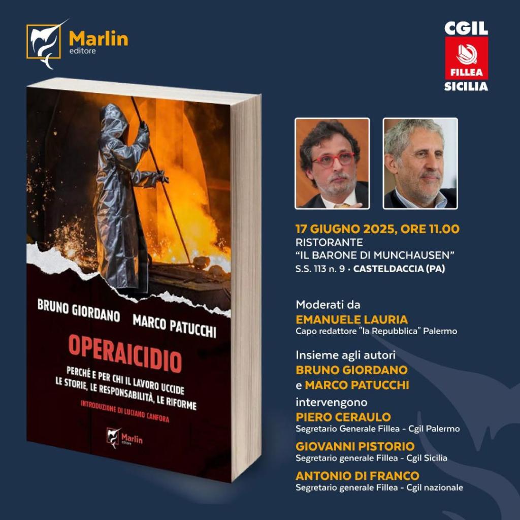 «Si terrà oggi alle 11, a “Il barone di Munchausen” di Casteldaccia, nel Palermitano, la presentazione del libro “Operaicidio”». Lo annuncia Giovanni Pistorio, segretario generale della Fillea Cgil Sicilia, che aggiunge: «Saranno presenti gli autori, Bruno Giordano, magistrato presso la Corte di cassazione e già direttore generale dell’Ispettorato nazionale del lavoro, e Marco Patucchi, giornalista di “la Repubblica”, dove si occupa di economia e politica». Il dibattito sarà moderato da Emanuele Lauria, caporedattore di “la Repubblica” Palermo. Interverranno: Piero Ceraulo, segretario generale della Fillea Cgil Palermo, Giovanni Pistorio, segretario generale della Fillea Cgil Sicilia, Francesco Lucchesi, segretario della Cgil Sicilia, e Antonio Di Franco, segretario generale della Fillea Cgil nazionale. Presente l’intera assemblea generale di Fillea Cgil Sicilia appositamente convocata.