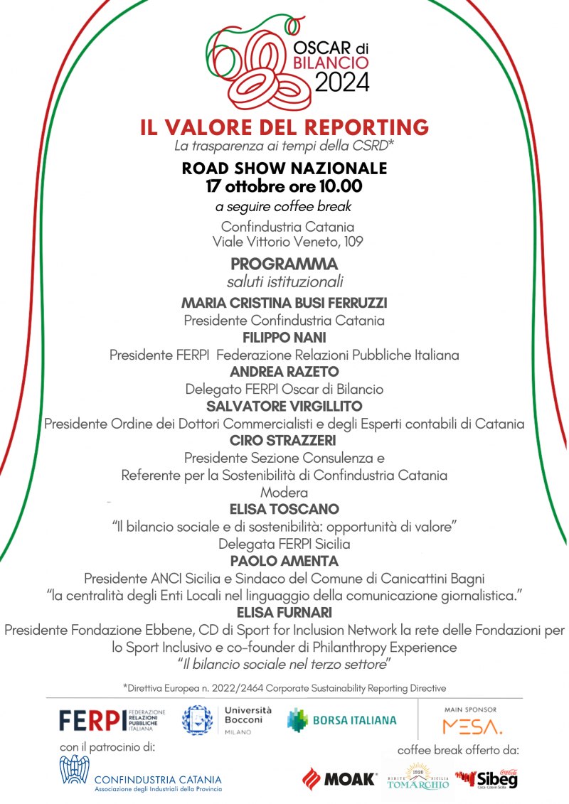 Fa tappa a Catania il Road Show “IL VALORE DEL REPORTING. La trasparenza ai tempi della CSRD” dell’Oscar di Bilancio 60a edizione. L’appuntamento è il 17 ottobre, alle ore 10.00, nella sede di Confindustria (viale Vittorio Veneto 109). L’evento è organizzato dalla delegazione siciliana di FERPI (FEDERAZIONE RELAZIONI PUBBLICHE ITALIANA). Il coffee break è offerto da MOAK, Sibat Tomarchio e Sibeg.