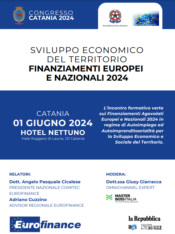 Si terrà a Catania presso l’Hotel Europa, alle ore 16:00, del 1° giugno 2024 il convegno “Sviluppo Economico del Territorio: finanziamenti europei e nazionali 2024” promosso dal COMITEC – Comitato Nazionale Tecnico Autoimpiego al fine di presentare i risultati ottenuti nell’ultimo anno attraverso l’impiego della Finanza Agevolata di Stato e mediante l’attuazione del Piano di Sviluppo Territoriale Diretto. Decine di imprese finanziate e centinaia di migliaia di euro erogati a donne, giovani ed imprese siciliane per la creazione di iniziative imprenditoriali concretamente finanziate con fondi europei per attività utili ai cittadini, agli imprenditori e alla collettività tutta. Durante il convegno saranno presentati importanti aggiornamenti per enti locali, professionisti, imprese e cittadini circa tutte le opportunità di finanziamento Europeo e Nazionale dal 2024 al 2026, per l’utile impiego dei miliardi di euro stanziati dall’Europa a favore dell’Italia ed in particolare delle imprese per investimenti strategici produttivi nella regione Sicilia. Sarà presente il Dott. P. Angelo Cicalese in qualità di Presidente del Comitato Nazionale Tecnico per l’Autoimpiego, massimo esperto nel settore riconosciuto a livello nazionale come eccellenza della finanza agevolata in “Eccellenza Economia” pubblicato da La Repubblica.