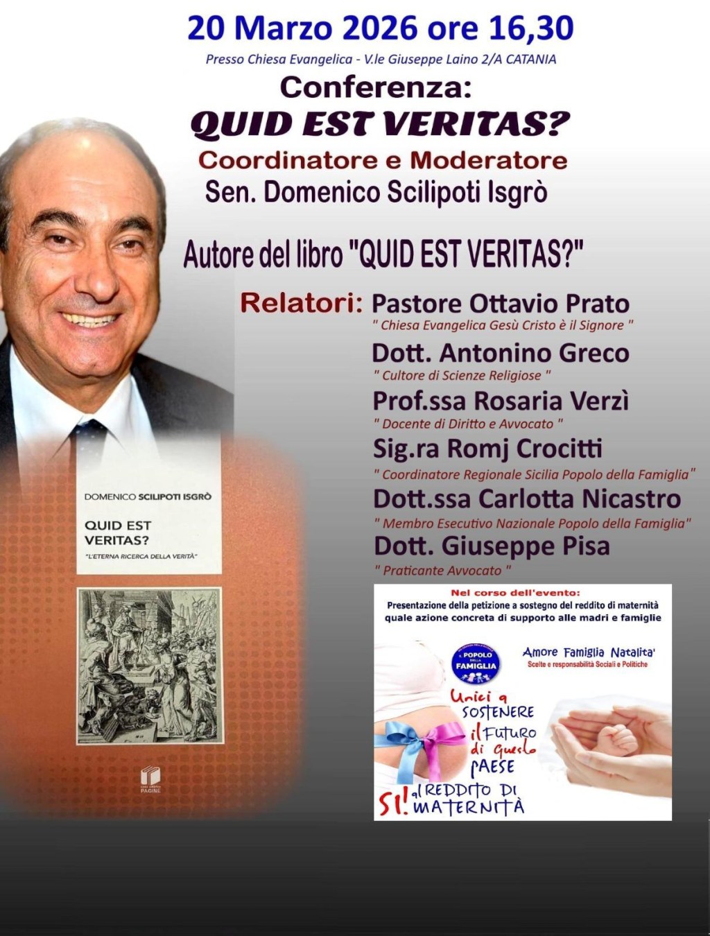 Venerdì 20 marzo 2026, alle ore 16.30, presso la Chiesa Evangelica di viale Giuseppe Laino 2/A a Catania, si terrà la presentazione dell’opera “Quid est Veritas?”, del sen. Domenico Scilipoti Isgrò e del giornalista Bruno Volpe.