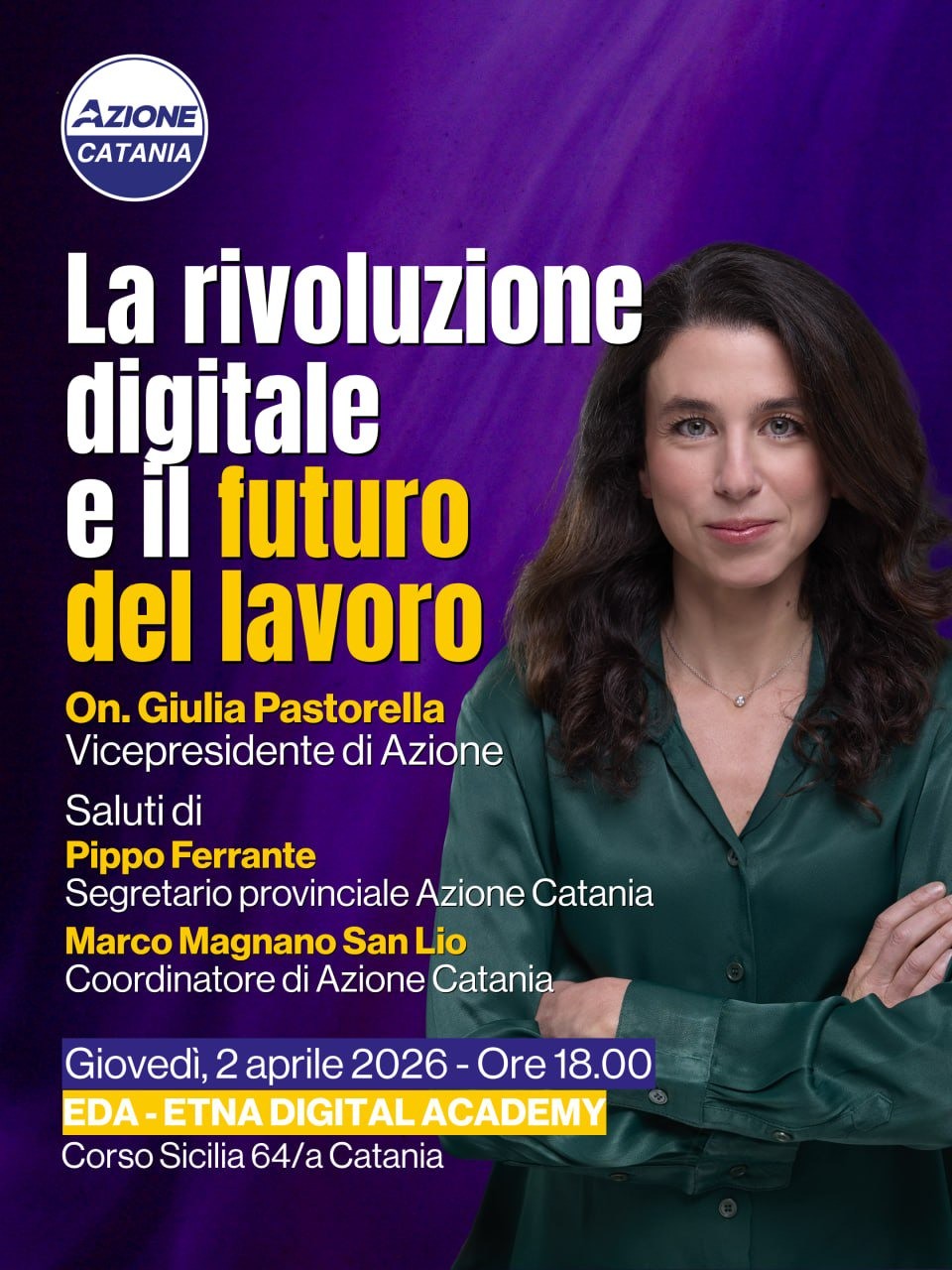 Innovazione tecnologica, valorizzazione dei talenti e contrasto alla fuga di cervelli: saranno questi i temi al centro dell’incontro pubblico che vedrà protagonista l’onorevole Giulia Pastorella, vicepresidente di Azione, in programma giovedì 2 aprile alle ore 18.00 presso la sede EDA di Corso Sicilia 64/A.