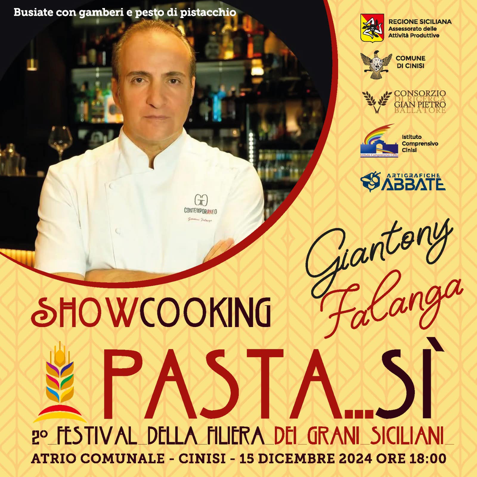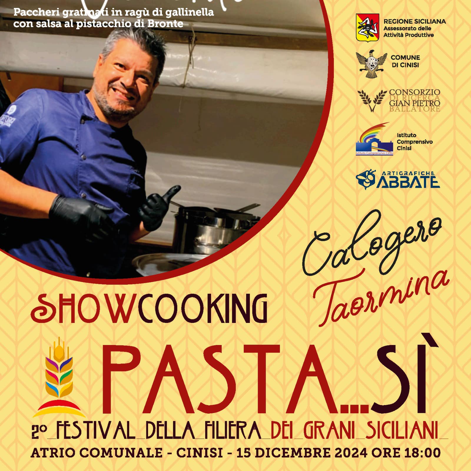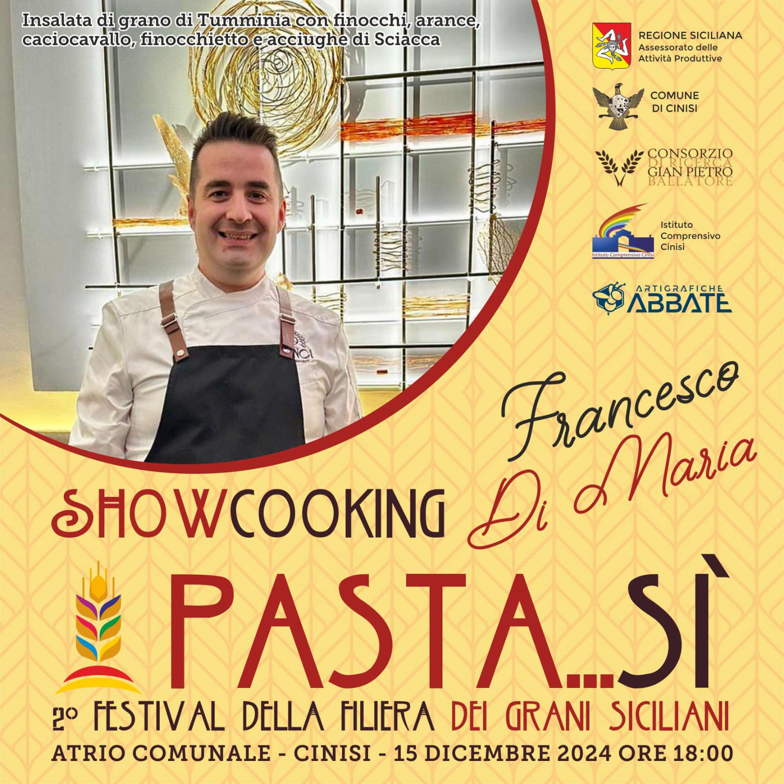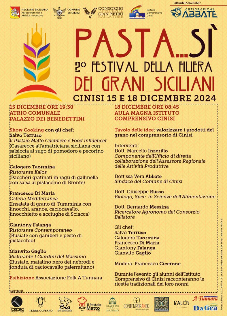 Domenica 15 Dicembre 2024 presso l’atrio del Palazzo dei Benedettini di Cinisi (Pa) con un intenso e raffinato show cooking e mercoledì 18 dicembre 2024 con una tavola rotonda presso l’aula magna dell’Istituto comprensivo di Cinisi, si svolgerà la seconda edizione della manifestazione “Pasta…Si, Festival della Filiera dei Grani Siciliani”.