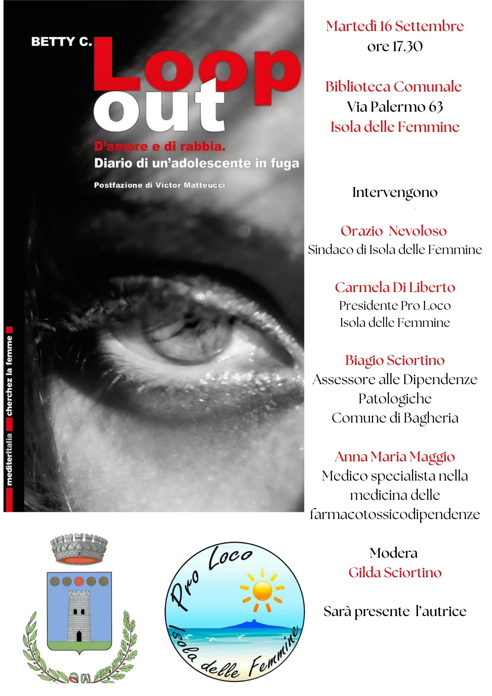 Una testimonianza forte e diretta, la voce di una giovane donna che rompe gli schemi e va contro ogni omertà, quella di Betty C., giovanissima autrice del libro “Loop Out. D’amore e di rabbia. Diario di una adolescente in fuga” (319 pagine), edito da Mediter Italia (foto di copertina di Shobha, postfazione di Victor Matteucci) che sarà presentato alle 17,30 di martedì 16 settembre nella Biblioteca comunale di Isola delle Femmine.