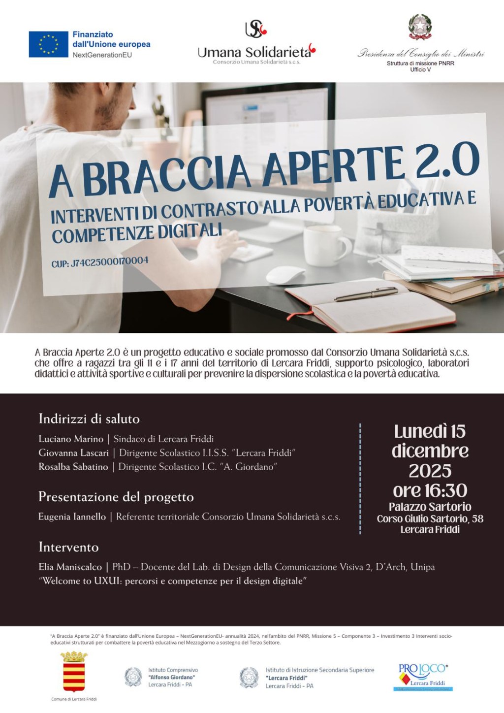 Dopo i saluti istituzionali di Luciano Marino, Sindaco di Lercara Friddi; Giovanna Lascari, Dirigente Scolastico dell’I.I.S.S. “Lercara Friddi”; Rosalba Sabatino, Dirigente Scolastico dell’I.C. “A. Giordano”; il progetto sarà illustrato nel dettaglio da Eugenia Iannello, Referente territoriale del Consorzio Umana Solidarietà s.c.s. Seguirà l’intervento di Elia Maniscalco, PhD e Docente del Lab. di Design della Comunicazione Visiva 2, D’Arch, Unipa sul tema “Welcome to UXUI: percorsi e competenze per il design digitale”.