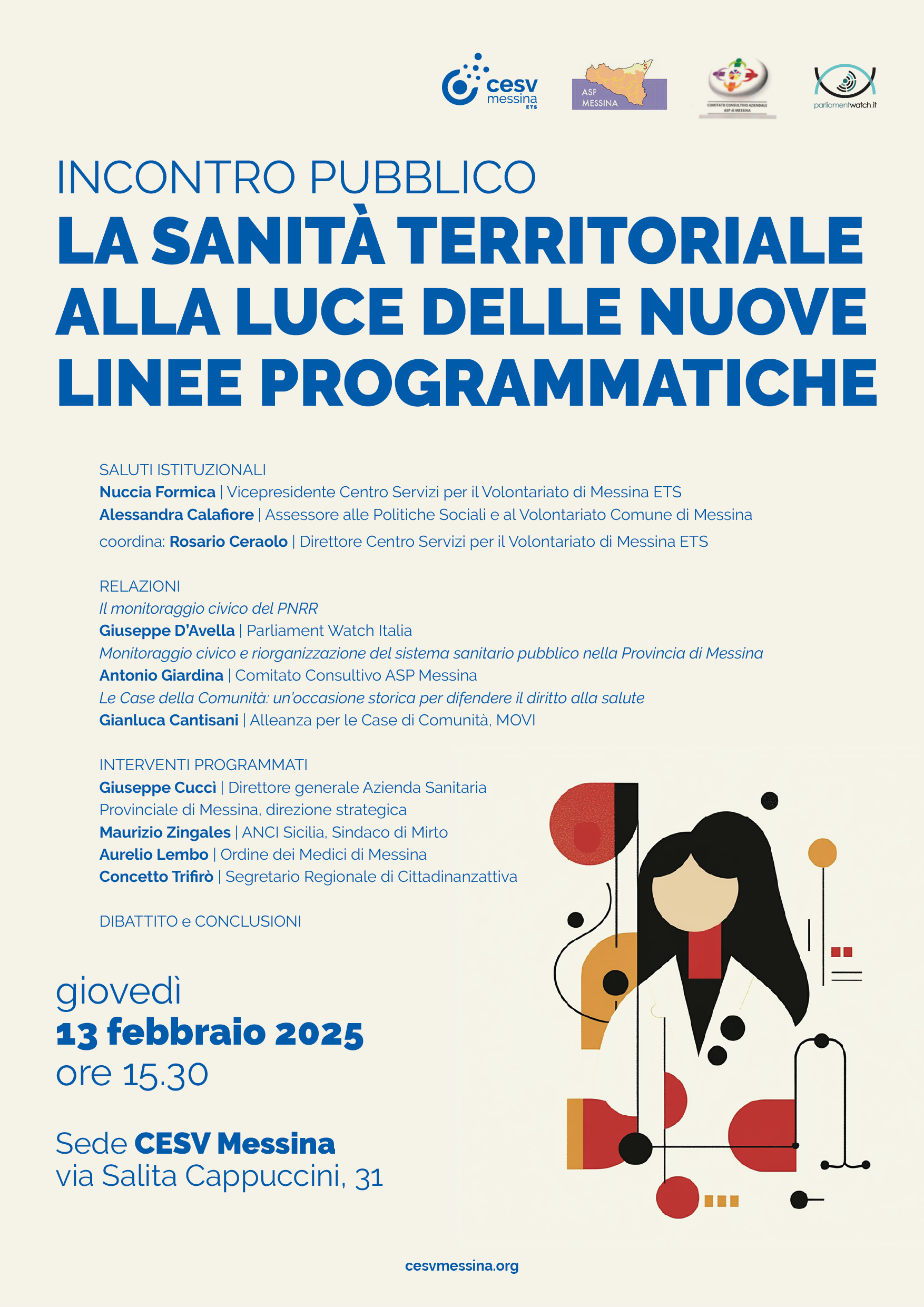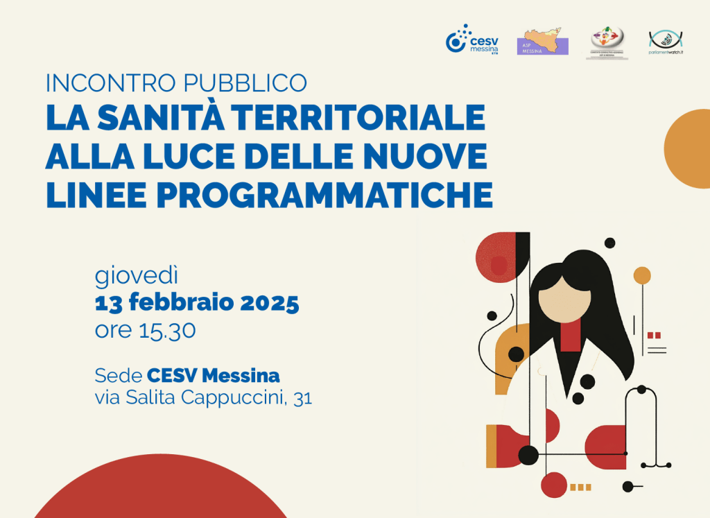 Si terrà giovedì 13 febbraio a partire dalle ore 15:30, nella sala formazione del CESV Mes-sina (via Salita Cappuccini 31), l’incontro pubblico sulla “Sanità territoriale alla luce delle nuove linee programmatiche” promosso dal Comitato Consultivo dell’ASP, dal Centro Servi-zi per il Volontariato e dall’Associazione Parliament Watch Italia (PWI).