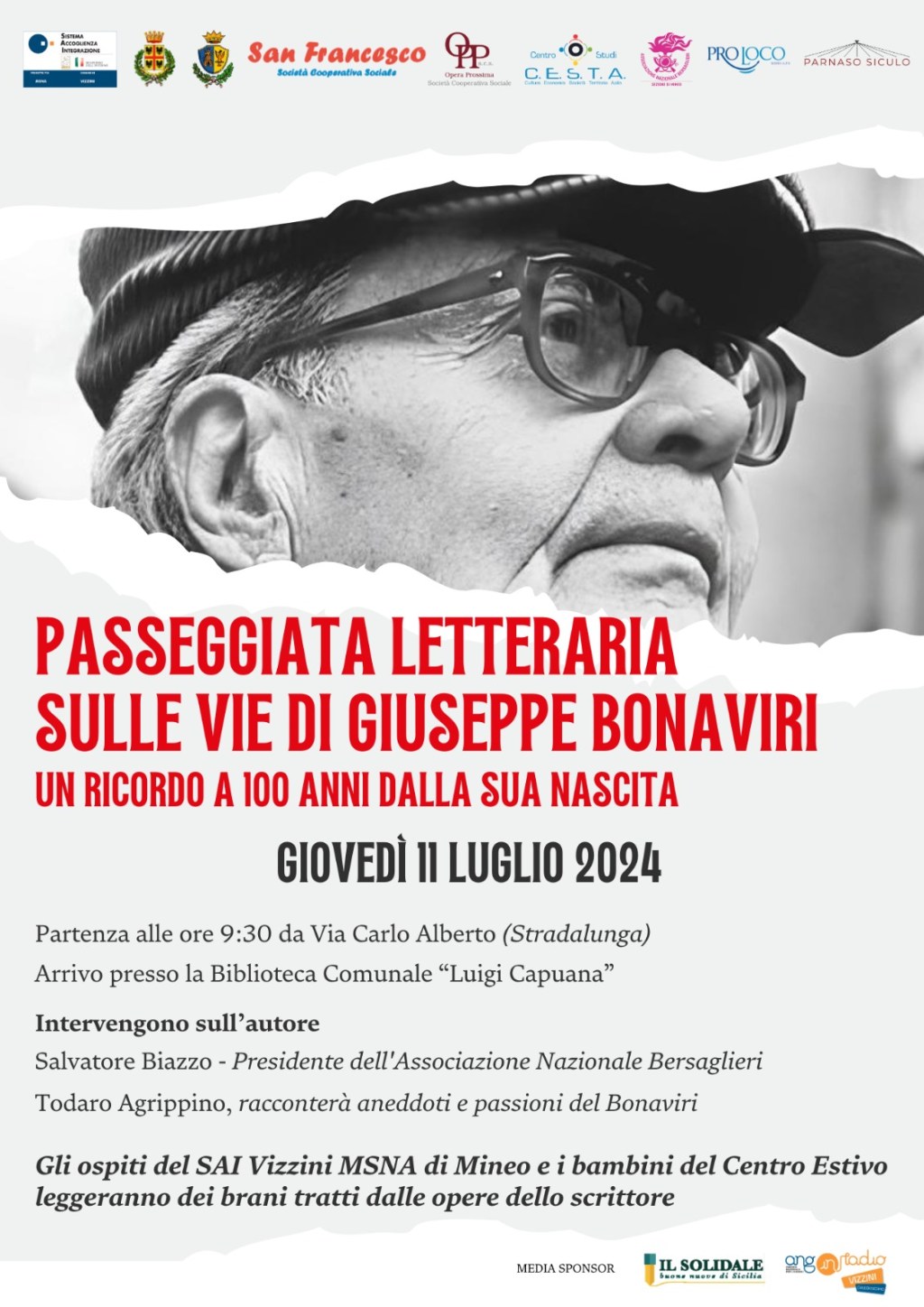 L’iniziativa organizzata all’interno del Progetto SAI di Vizzini MSNA nella struttura di Mineo, vede tra i promotori le cooperative San Francesco s.c.s. e Opera Prossima s.c.s., il Centro Studi C.E.S.T.A., la Pro Loco di Mineo A.P.S., l’Associazione Parnaso Siculo, l’Associazione nazionale bersaglieri sezione Mineo, che hanno unito le forze per onorare la memoria dello scrittore.