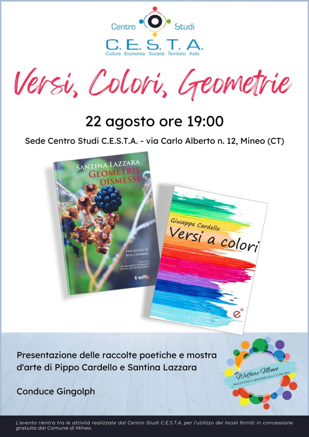 “Versi, Colori, Geometrie” è il titolo dell’evento culturale organizzato dal Centro Studi C.E.S.T.A. che si terrà il prossimo 22 agosto alle ore 19.00 nella sede di via Carlo Alberto n. 12 a Mineo (CT).