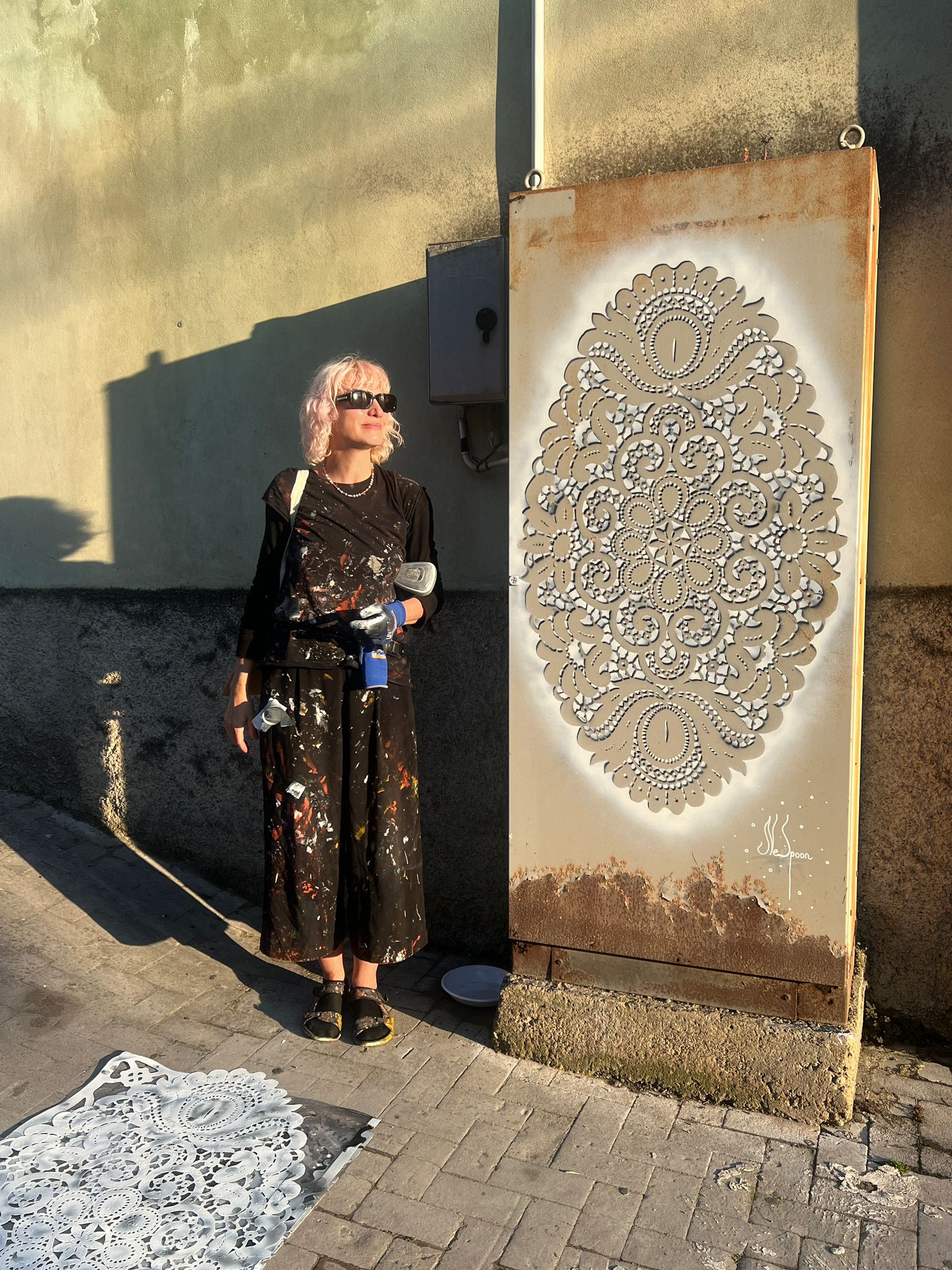 E Daniela Macrì, presidente di Verderame progetto cultura sottolinea: «L’arte urbana contemporanea ha la forza e l’immaginazione di leggere il passato, di reinterpretarlo e restituirlo alle comunità attraverso nuove forme espressive che richiamano la tradizione e la proiettano nel futuro, in un dialogo continuo tra epoche lontane e visioni future». «Mi piace pensare che le trame preziose del pizzo a tombolo – aggiunge Macrì – siano la metafora dei legami solidi che le comunità riescono ad attivare. Non si tratta solo di abbellire uno spazio, ma di costruire un terreno di consapevolezza e cittadinanza attiva». «Con la sua tecnica audace e dirompente – conclude – NeSpoon si fa portavoce di un’arte che è al tempo stesso espressione estetica e rivendicazione di diritti, sociali, umani. Per Verderame progetto cultura, che si occupa da sempre di conservazione e valorizzazione del patrimonio culturale, questa occasione rappresenta un grande privilegio. Alla comunità di Mirabella va tutta la mia profonda gratitudine».