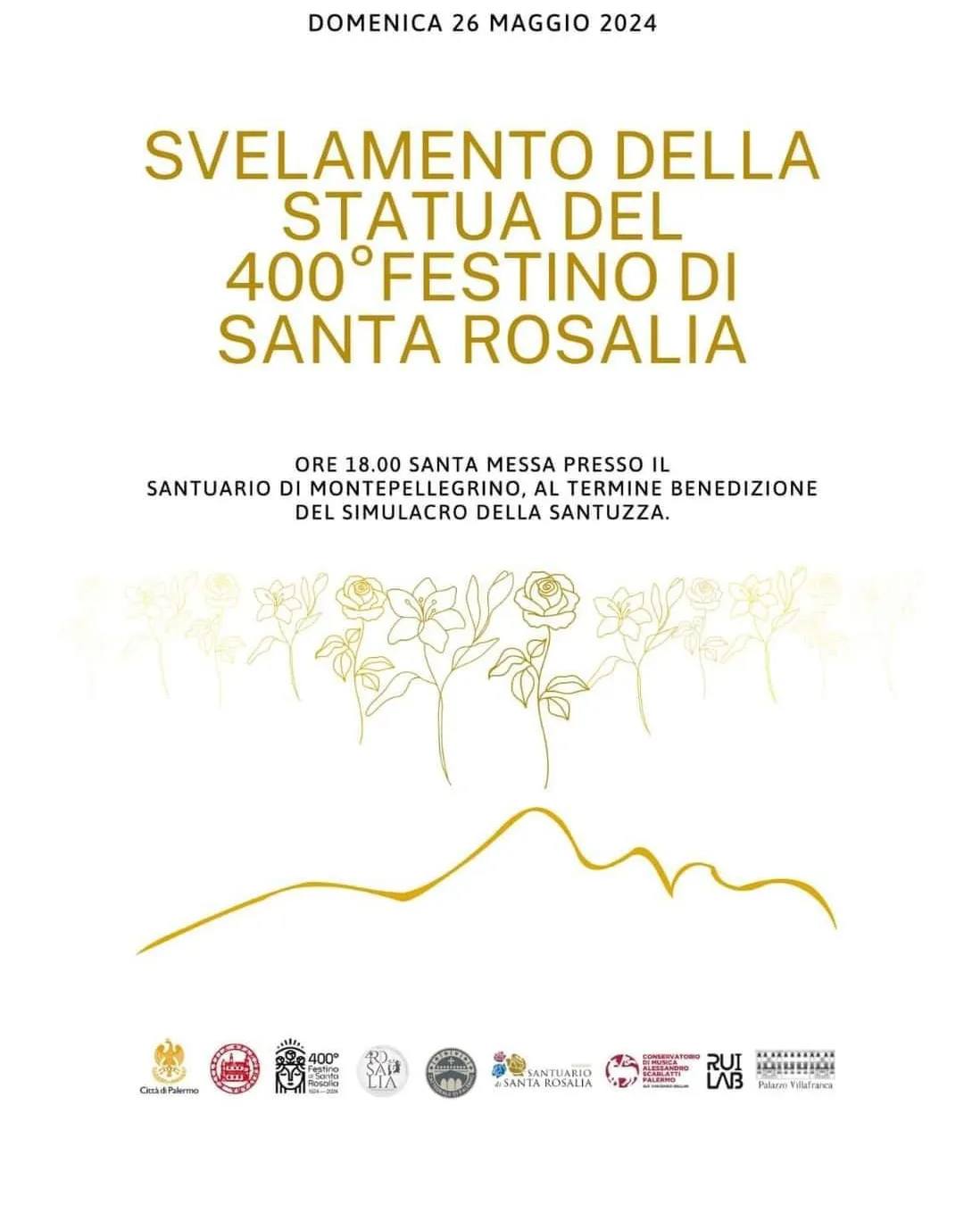 Domenica 26 maggio, alle ore 18, presso il Santuario di Monte Pellegrino avrà luogo lo svelamento della Statua del 400° Festino di Santa Rosalia, in programma anche la Santa Messa al Santuario e, al termine della funzione, si procederà con la benedizione del Simulacro della Santuzza. La statua di Santa Rosalia, che al momento è ospitata a Palazzo Alliata di Villafranca, a piazza Bologni, all’interno della settecentesca Sala dello Stemma, è stata realizzata dall’artista palermitano Filippo Sapienza, ed è in corso di ultimazione.