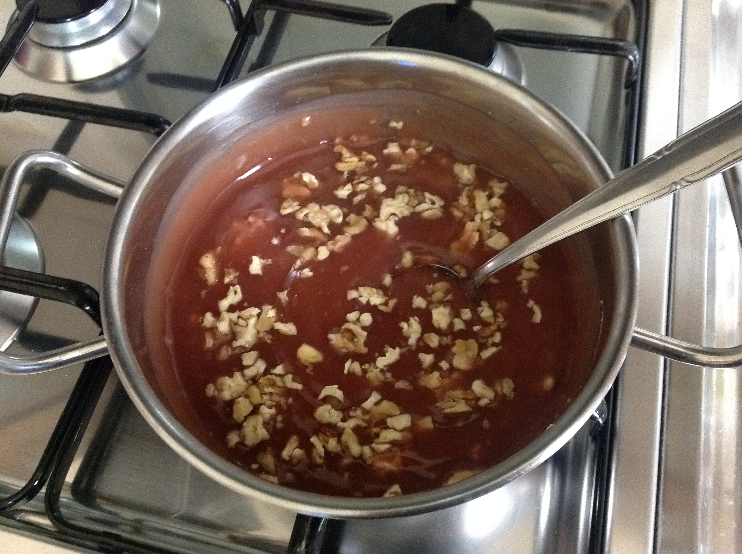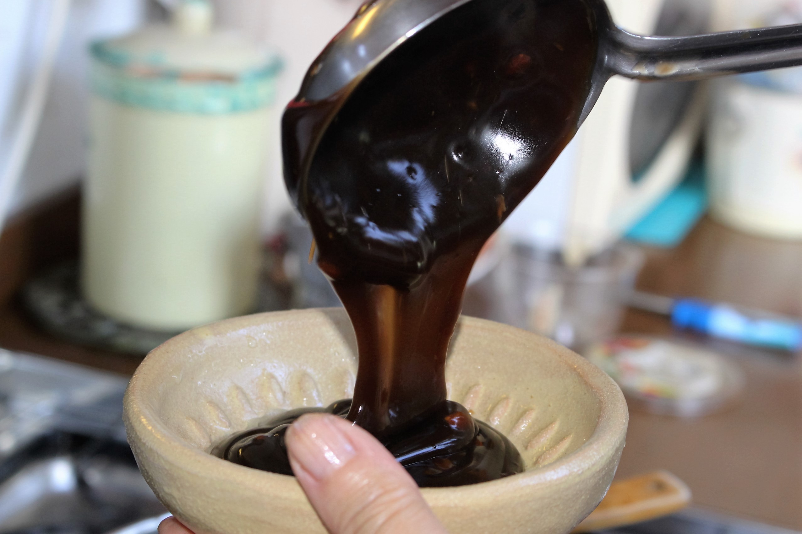 Questa miscela di ingredienti si mette in pentola, quindi su un fornello a fuoco lento mescolando spesso perché raggiunga lentamente il punto d’ebollizione, quando si aggiunge in pentola una manciata di mandorle tostate tritate grossolanamente. Quando il liquido si addensa a sufficienza è pronto per essere versato negli stampi o semplicemente in piattini di ceramica
