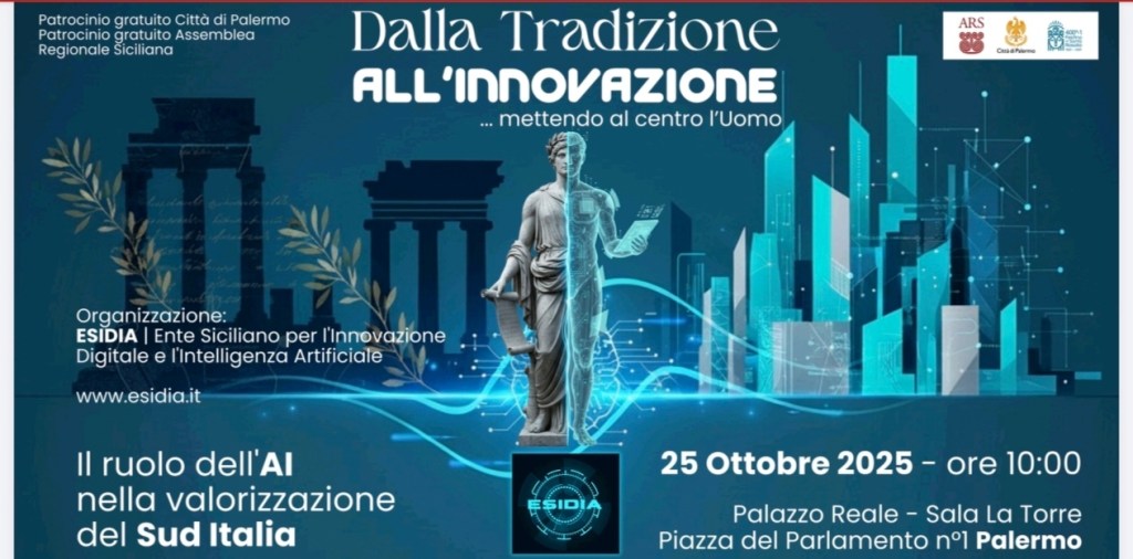Il 25 ottobre prossimo, nella prestigiosa Sala “La Torre” di Palazzo Reale, sede dell’Assemblea Regionale Siciliana, si terrà il convegno dal titolo “Dalla Tradizione all’Innovazione: il ruolo dell’Al nella valorizzazione del Sud Italia”. L’evento è promosso dall’associazione ESIDIA – Ente Siciliano per l’Innovazione Digitale e l’Intelligenza Artificiale e patrocinato dall’Assemblea Regionale Siciliana e dalla Città di Palermo,