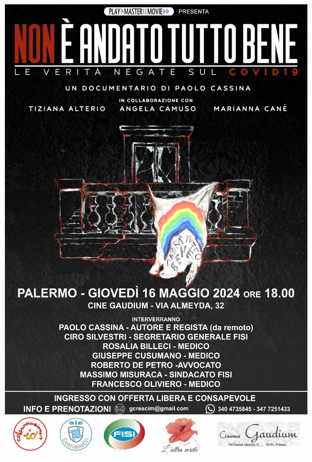 Dopo il successo delle 6 anteprime nazionali, il docu-film denuncia “Non è andato tutto bene- Le verità negate sul Covid 19”, del regista Paolo Cassina, già firma di “Invisibili”, sulle vittime del vaccino, arriva anche a Palermo, giovedì 16 maggio, ore 18.00, Cine Gaudium, in via Almeyda 32. Durata 175 minuti. L’evento è organizzato dalle associazioni Io, ContiamoCi!, dal sindacato FISI e dal comitato l’Altra Verità con la collaborazione delle sig.re Manuela Sandri di Artmadeinicily e Neptula Liliana Laviola.