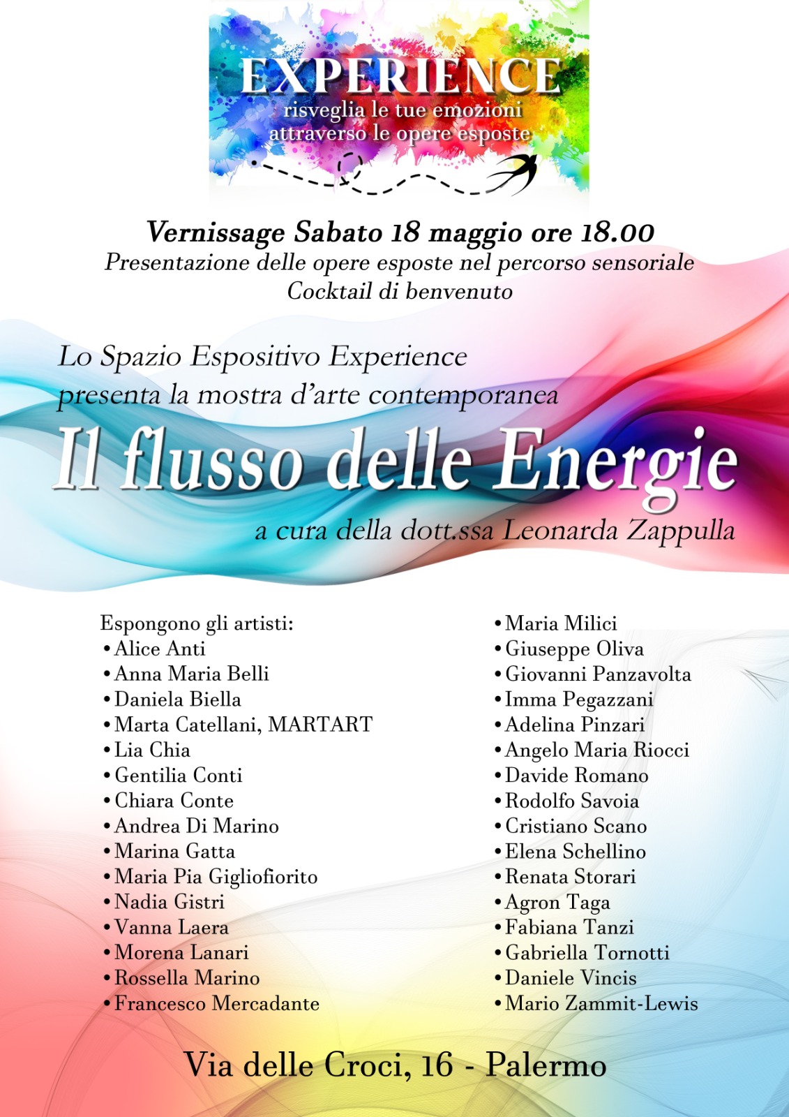 “Il flusso delle Energie. Connessioni Universali nell’Arte” è il titolo della mostra corale in programma a Palermo a partire da sabato 18 maggio nello spazio espositivo “Experience”, in via delle Croci 16.