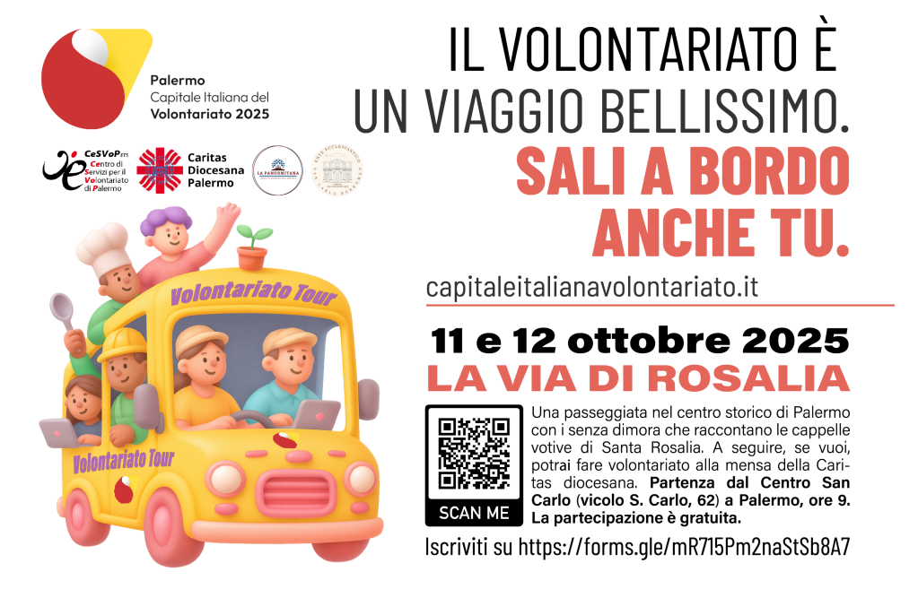 L’iniziativa “Volontariato Tour – La via di Rosalia” è prevista nei giorni di Sabato 11 e Domenica 12 ottobre con raduno alle ore 9,00 presso il Centro San Carlo (vicolo S. Carlo, 62). Gli itinerari saranno accompagnati dalle persone senza dimora. La passeggiata si inserisce tra gli eventi di Palermo Capitale Italiana del Volontariato 2025 ed è promossa da CeSVoP, Caritas Palermo, cooperativa La Panormitana ed ente San Carlo Borromeo.