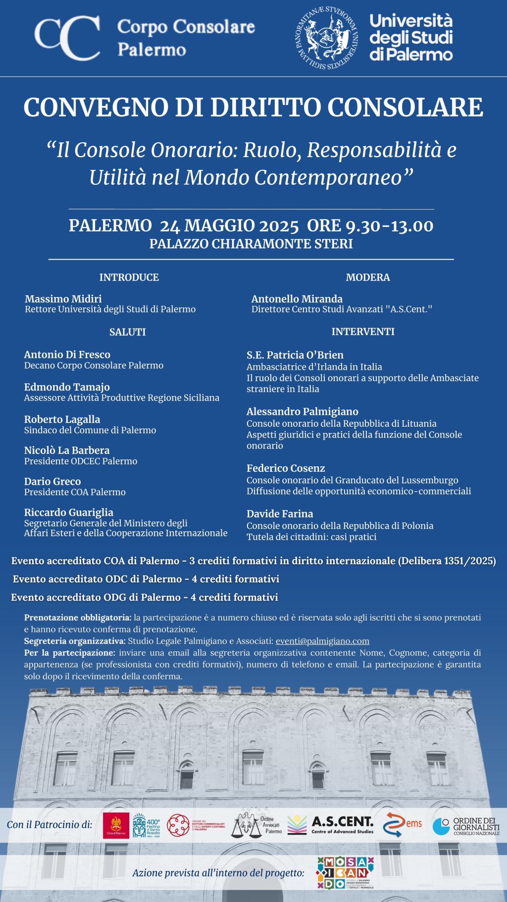 Si terrà sabato 24 maggio 2025, dalle ore 9.30 alle 13.00, presso Palazzo Chiaramonte Steri di Palermo, in piazza Marina 1, il convegno di Diritto Consolare dal titolo: “Il Console Onorario: Ruolo, Responsabilità e Utilità nel Mondo Contemporaneo”.