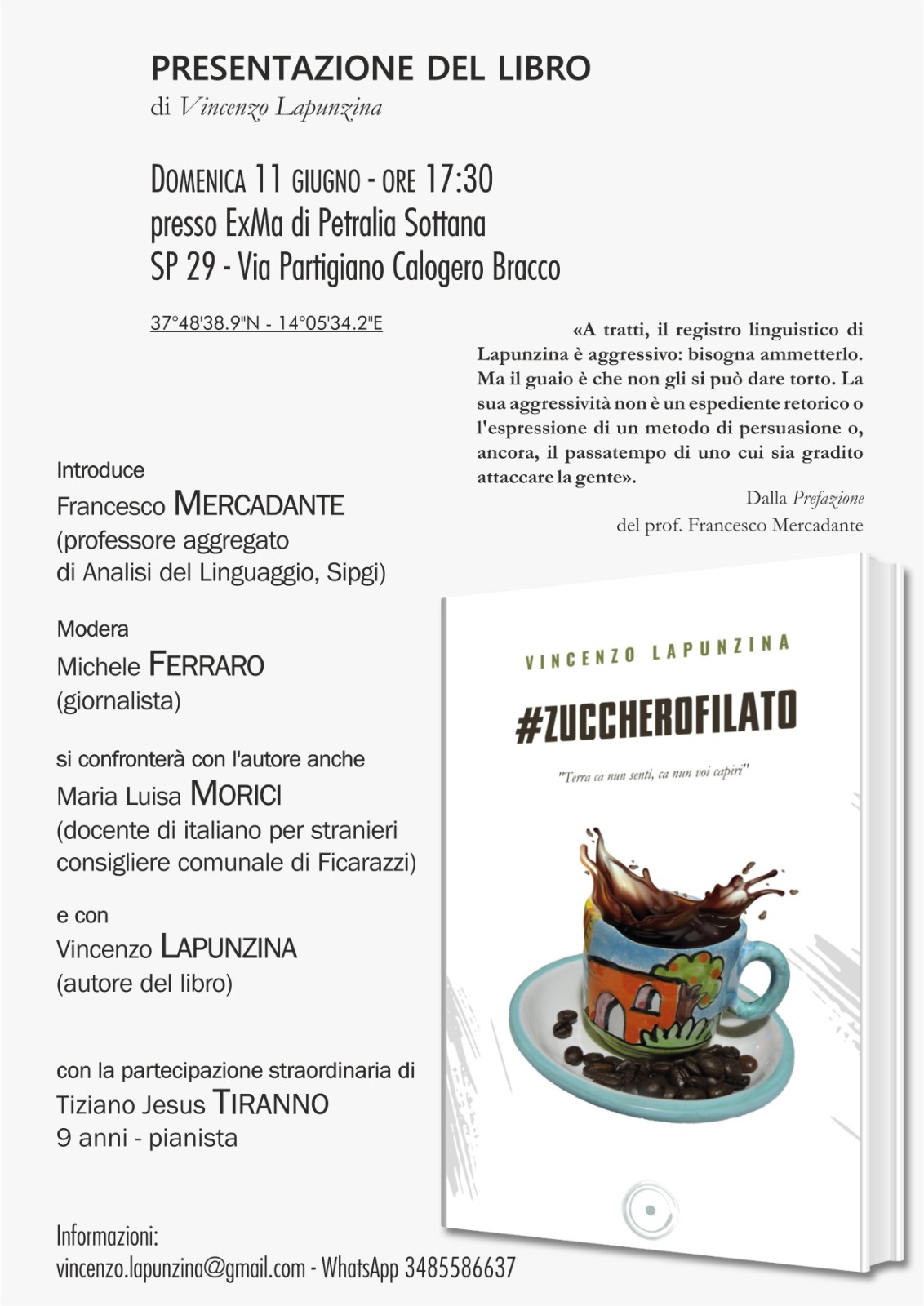 “#Zuccherofilato, terra can un senti, ca nun voi capiri” è il titolo del libro scritto da Vincenzo Lapunzina che verrà presentato domenica 11 giugno alle ore 17:30, presso l’ExMa di Petralia Sottana (Pa).