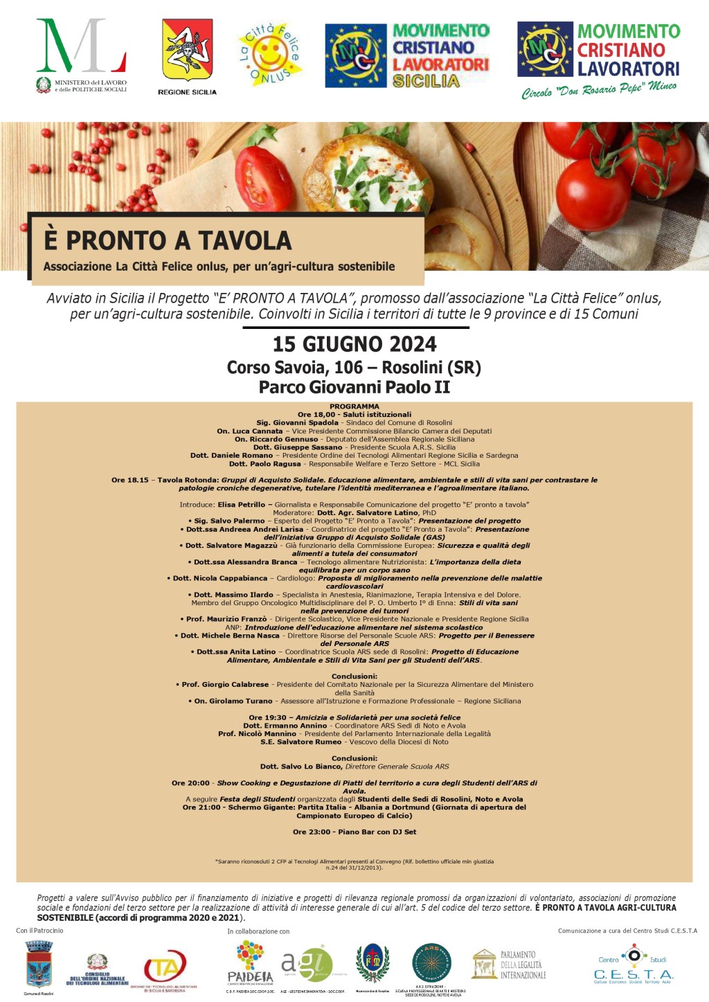 La giornata di sabato si aprirà alle 18:00 con i saluti istituzionali del Sindaco di Rosolini, Giovanni Spadola. Seguiranno gli interventi dell’on. Luca Cannata, Vice Presidente della Commissione Bilancio della Camera dei Deputati, e l’on. Riccardo Gennuso, Deputato dell’Assemblea Regionale Siciliana e Giuseppe Sassano, presidente scuola A.R.S. Sicilia. Saranno presenti anche Daniele Romano, Presidente dell’Ordine dei Tecnologi Alimentari Regione Sicilia e Sardegna, insieme al dott. Paolo Ragusa, Responsabile Welfare e Terzo Settore di MCL Sicilia.