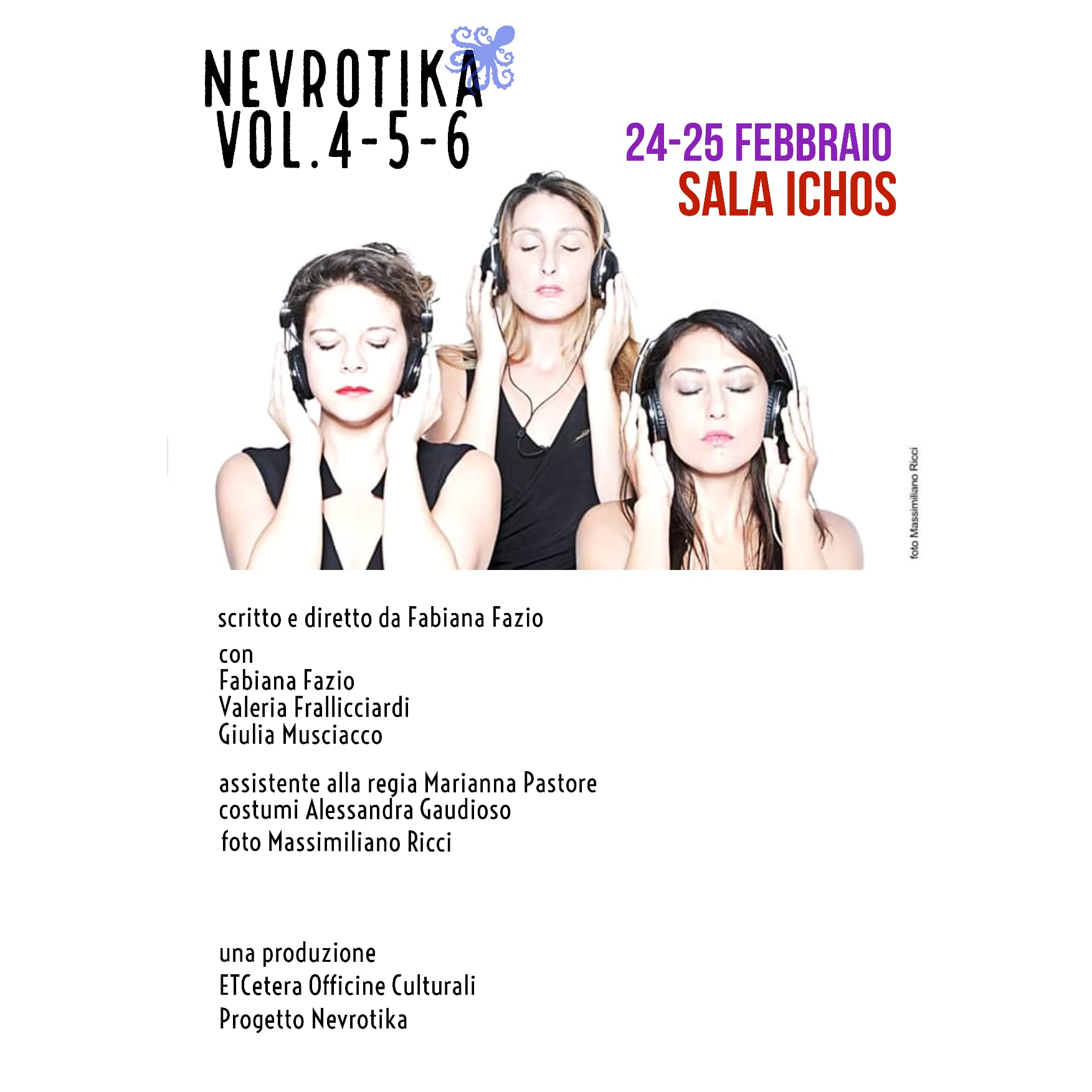 Sabato 24, alle 21, e domenica 25 febbraio, alle 19, va in scena “Nevrotika vol. 4-5-6” scritto e diretto da Fabiana Fazio, che è anche in scena con Valeria Frallicciardi e Giulia Musciacco. L’assistente alla regia è Marianna Pastore, i costumi di Alessandra Gaudioso e le foto di scena di Massimiliano Ricci. La produzione è Etcetera Officine Culturali e Progetto Nevrotika.