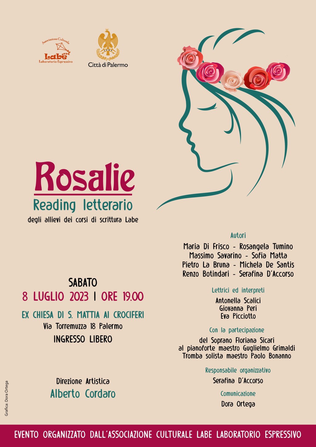 di via Torremuzza 18, a Palermo, avrà luogo il reading letterario dal titolo “ROSALIE”. Durante la serata verranno letti otto racconti scritti dagli allievi dei corsi di scrittura dell’associazione culturale Labe Laboratorio Espressivo, che organizza l’evento con il patrocinio del Comune di Palermo. Direzione artistica di Alberto Cordaro.