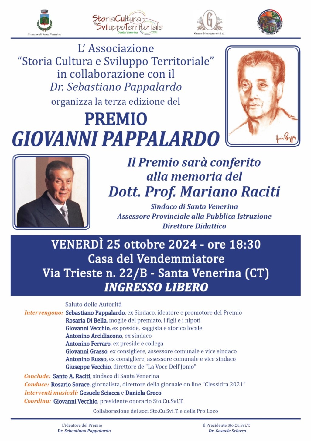 A Santa Venerina si svolge la III^ Edizione del “Premio Giovanni Pappalardo”, indimenticabile figura di uomo, medico e Sindaco della cittadina. L’evento avrà luogo venerdì 25 ottobre alla Casa del Vendemmiatore ( Via Trieste n.22 )con inizio alle 18.30. Quest’anno il riconoscimento sarà conferito alla memoria del Dott. Prof. Mariano Raciti, Direttore Didattico, il quale ha ricoperto le cariche di Sindaco a Santa Venerina e Assessore Provinciale alla Pubblica Istruzione a Catania. La manifestazione è stata ideata dal dott. Sebastiano Pappalardo, responsabile della Gemas Management Srl, figlio del compianto Sindaco, che si è avvalso della collaborazione dell’Associazione Storia, Cultura e Sviluppo Territoriale e della Pro Loco di Santa Venerina. Il programma assai ricco di momenti rievocativi prevede numerosi interventi in memoria di Mariano Raciti tra cui Rosaria Di Bella, moglie del premiato; Giovanni Vecchio, ex preside, saggista e storico locale; Antonino Arcidiacono,ex sindaco; Giovanni Grasso e Antonino Russo,ex consiglieri comunali e assessori; Giuseppe Vecchio, Direttore del giornale “La Voce dello Jonio”. La conduzione è affidata al giornalista Rosario Sorace, Direttore del giornale on line “Clessidra2021″. Vi saranno intermezzi musicali di Gesuele Sciacca e Daniela Greco mentre alla fine interviene l’attuale sindaco di Santa Venerina Santo A. Raciti, figlio del premiato.