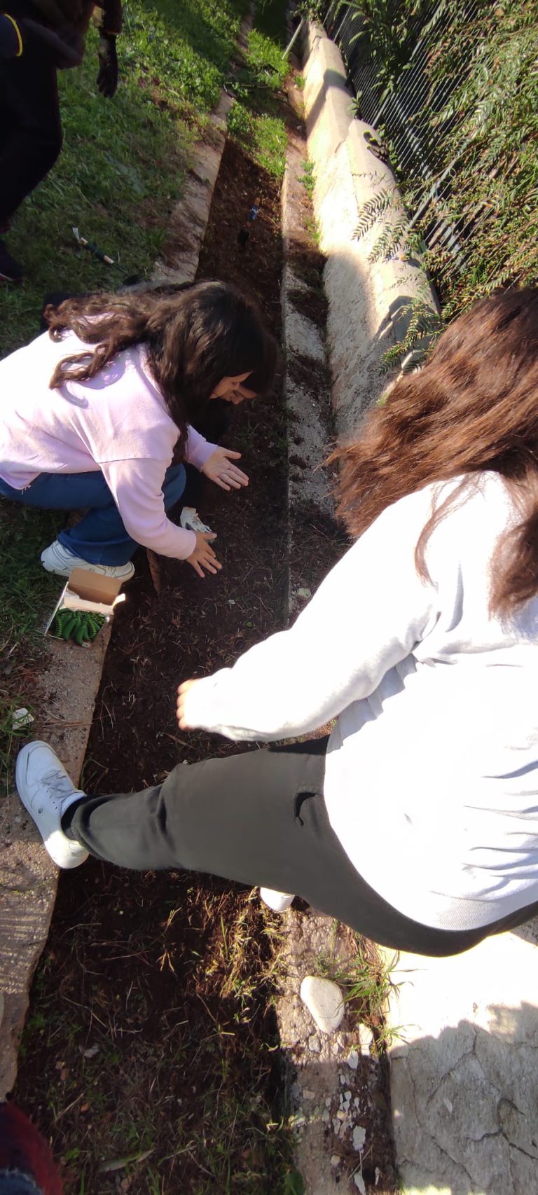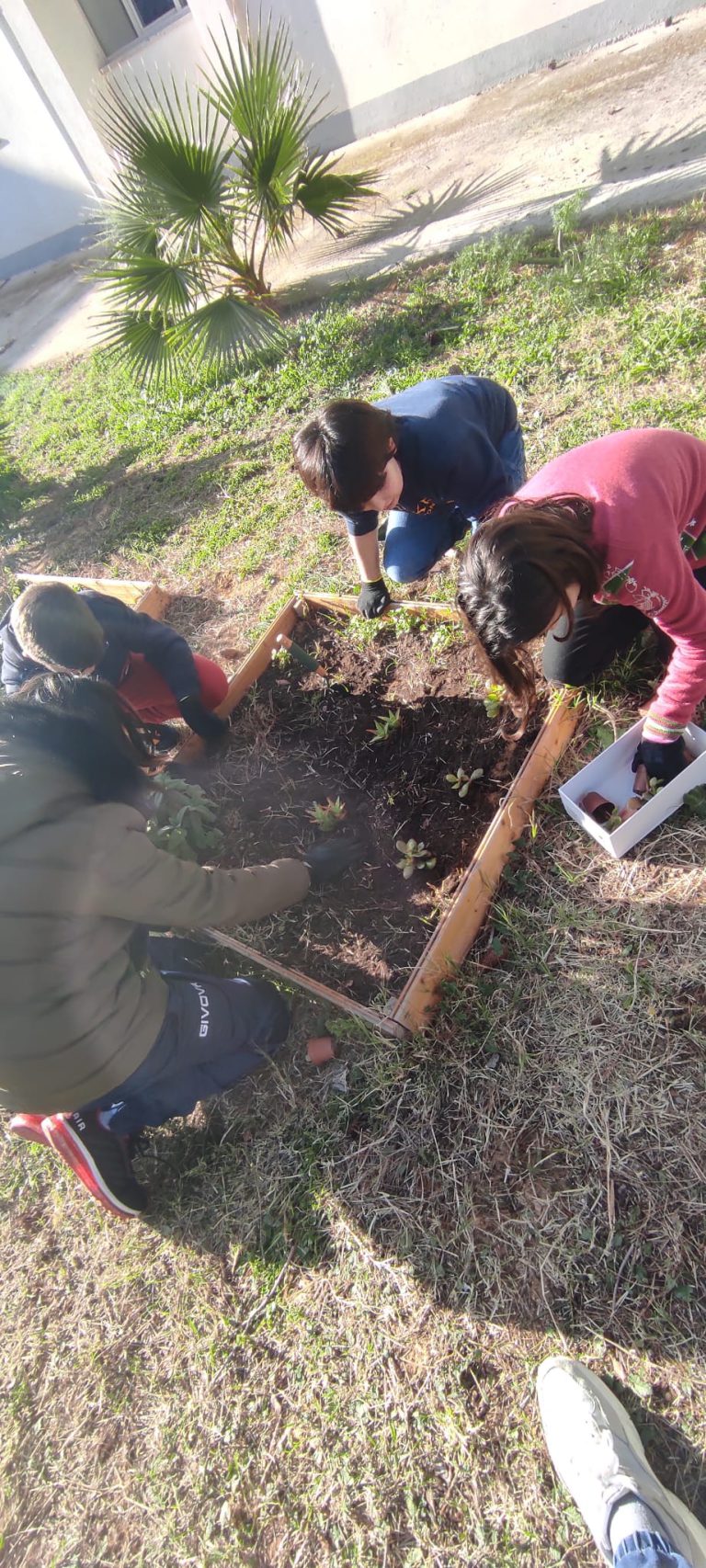 Pulizia delle aree verdi, piantumazione di primule e piante grasse. Realizzazione di oggetti di decoro per il giardino come mangiatoie per uccellini con materiale di riciclo.