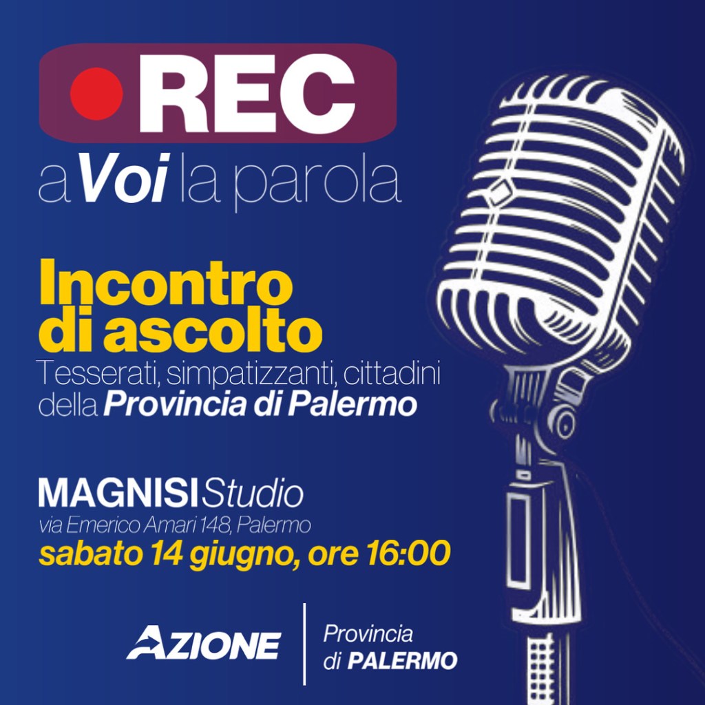 Un incontro aperto a cittadini, curiosi e simpatizzanti, oltreché ai tesserati di Azione della Provincia di Palermo: sabato 14 giugno alle ore 16:00 presso il Magnisi Studio di Palermo, in via Emerico Amari 148, si invita alla “partecipazione attiva” con l’evento “REC: A Voi la Parola”, momento di ascolto “libero” che accoglierà decine di cittadine e cittadini per dibattere temi quali lavoro, famiglia, sociale, mobilità, rifiuti, scuola, terzo settore, sanità e quant’altro inerente alla città di Palermo ed ai comuni della provincia.
