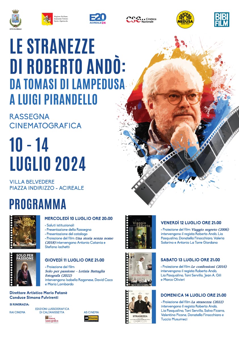 È tutto pronto ad Acireale per la rassegna cinematografica “Le stranezze di Roberto Andò: da Tomasi di Lampedusa e Luigi Pirandello”, in programma dal 10 al 14 luglio alla Villa Belvedere. Grande protagonista della kermesse, organizzata dal Comune di Acireale, con il patrocinio e il sostegno della Regione Siciliana e con la direzione artistica di Mario Patanè, sarà il pluripremiato regista e sceneggiatore Roberto Andò. Ma non sarà l’unico grande ospite delle quattro serate che alterneranno momenti di dibattito alla proiezione dei film del regista palermitano.