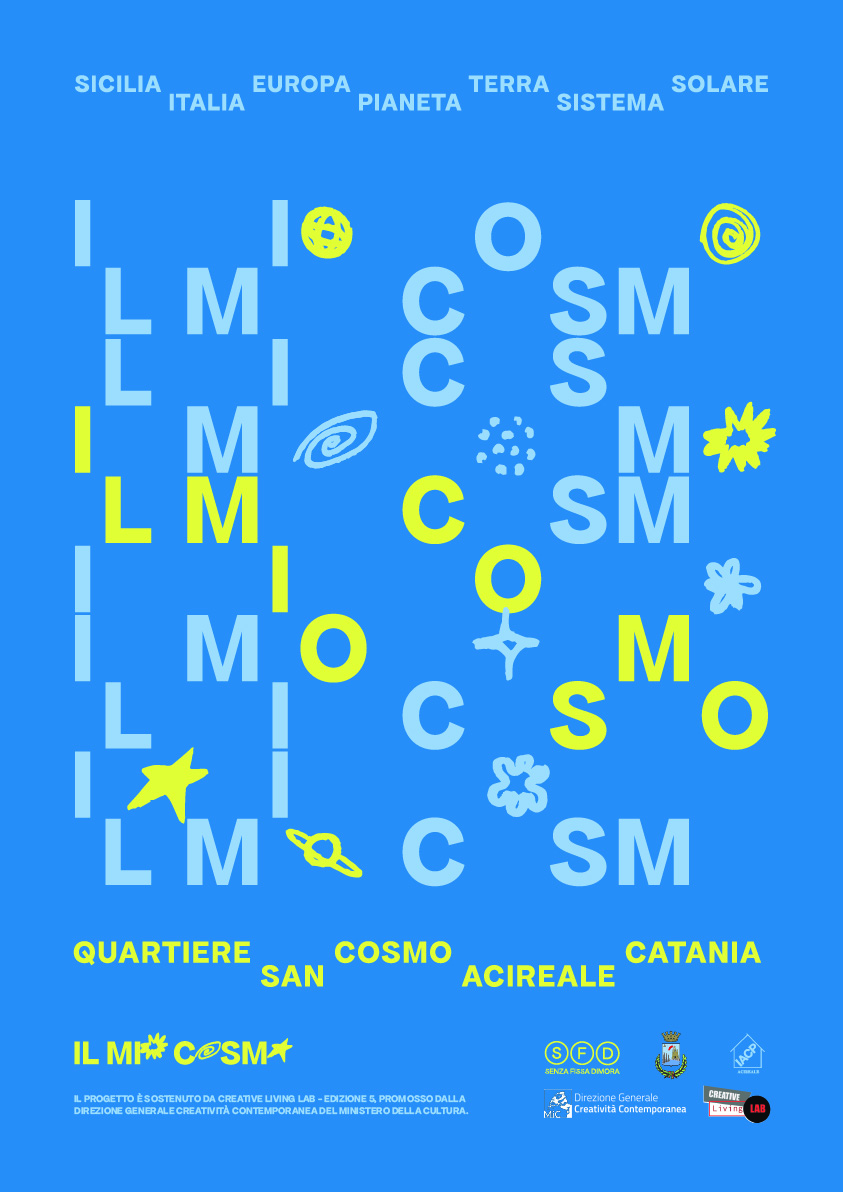 Il progetto “Il mio Cosmo” è realizzato dall’associazione Senza Fissa Dimora, che ne è promotrice e capofila. È realizzato grazie alla vittoria della quinta edizione di Creative Living Lab, promosso dalla Direzione Generale Creatività Contemporanea del Ministero della Cultura. Partner di progetto sono il Comune di Acireale, l’associazione Avaja e l’associazione Analogique, e con il patrocinio dell’Istituto Autonomo Case Popolari (I.A.C.P.) del Comprensorio di Acireale.