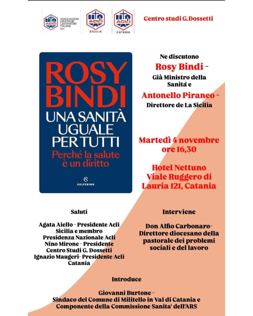 L’incontro, organizzato dalle Acli Sicilia e dal Centro Studi G. Dossetti, vedrà la partecipazione dell’autrice Rosy Bindi, già Ministra della Sanità, protagonista di una lunga esperienza istituzionale e sociale dedicata ai temi del bene comune, della giustizia e della solidarietà, che dialogherà con Antonello Piraneo, direttore del quotidiano La Sicilia.