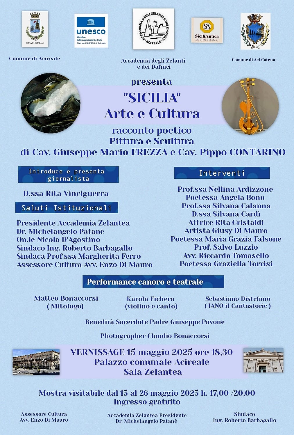 Nell’ ambito del 79° anniversario dell’Autonomia Siciliana, il 15 maggio alle ore 18:30, ospitata presso il Palazzo di Città di Acireale, Sala Zelantea, verrà inaugurata la mostra “Sicilia. Arte e Cultura” racconto poetico Pittura e Scultura di Cav. Giuseppe Mario Frezza e Cav. Pippo Contarino.
