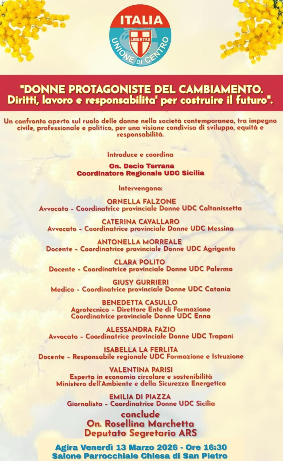 Agira si prepara ad accogliere un importante momento di confronto dedicato al ruolo delle donne nella società contemporanea. Venerdì 13 marzo 2026 alle ore 16:30, presso il Salone Parrocchiale della Chiesa di San Pietro, si terrà l’incontro dal titolo “Donne protagoniste del cambiamento. Diritti, lavoro e responsabilità per costruire il futuro”, promosso dall’Unione di Centro guidata in Sicilia dall’On. Decio Terrana, che introdurrà l’evento e coordinerà tutti gli interventi della manifestazione.