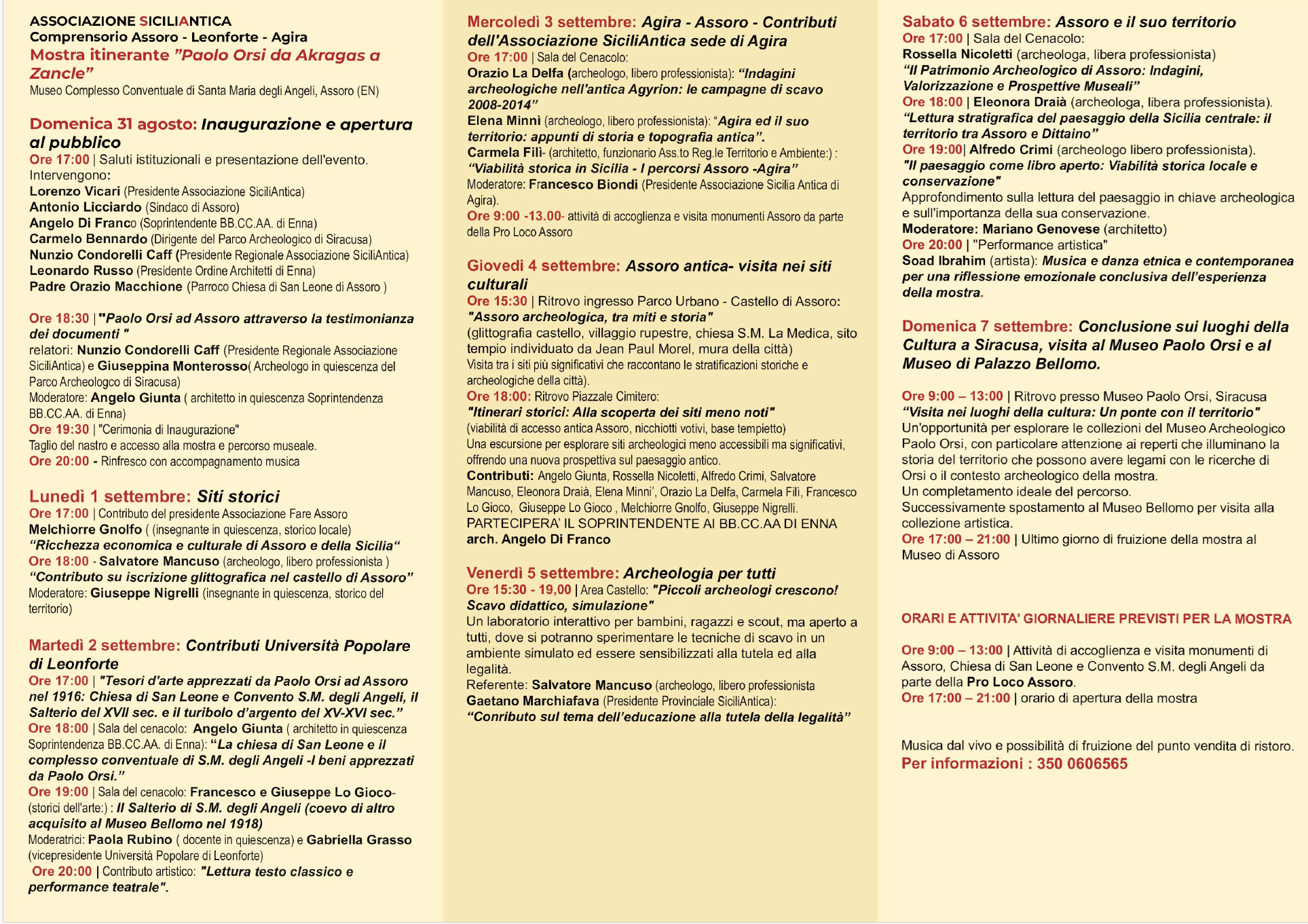 L’evento si apre domenica 31 agosto alle 17:00 con i saluti istituzionali di Lorenzo Vicari, presidente di SiciliAntica, e del sindaco Antonio Licciardo, insieme ad altre autorità locali e culturali come il Soprintendente BB.CC.AA. di Enna Angelo Di Franco. Segue la relazione dell’archeologa Giuseppina Monterosso su “Paolo Orsi ad Assoro attraverso la testimonianza dei documenti”, e la cerimonia di inaugurazione apre il percorso museale, accompagnata da un rinfresco con musica dal vivo dei maestri François Parisi e Claudio Piro.