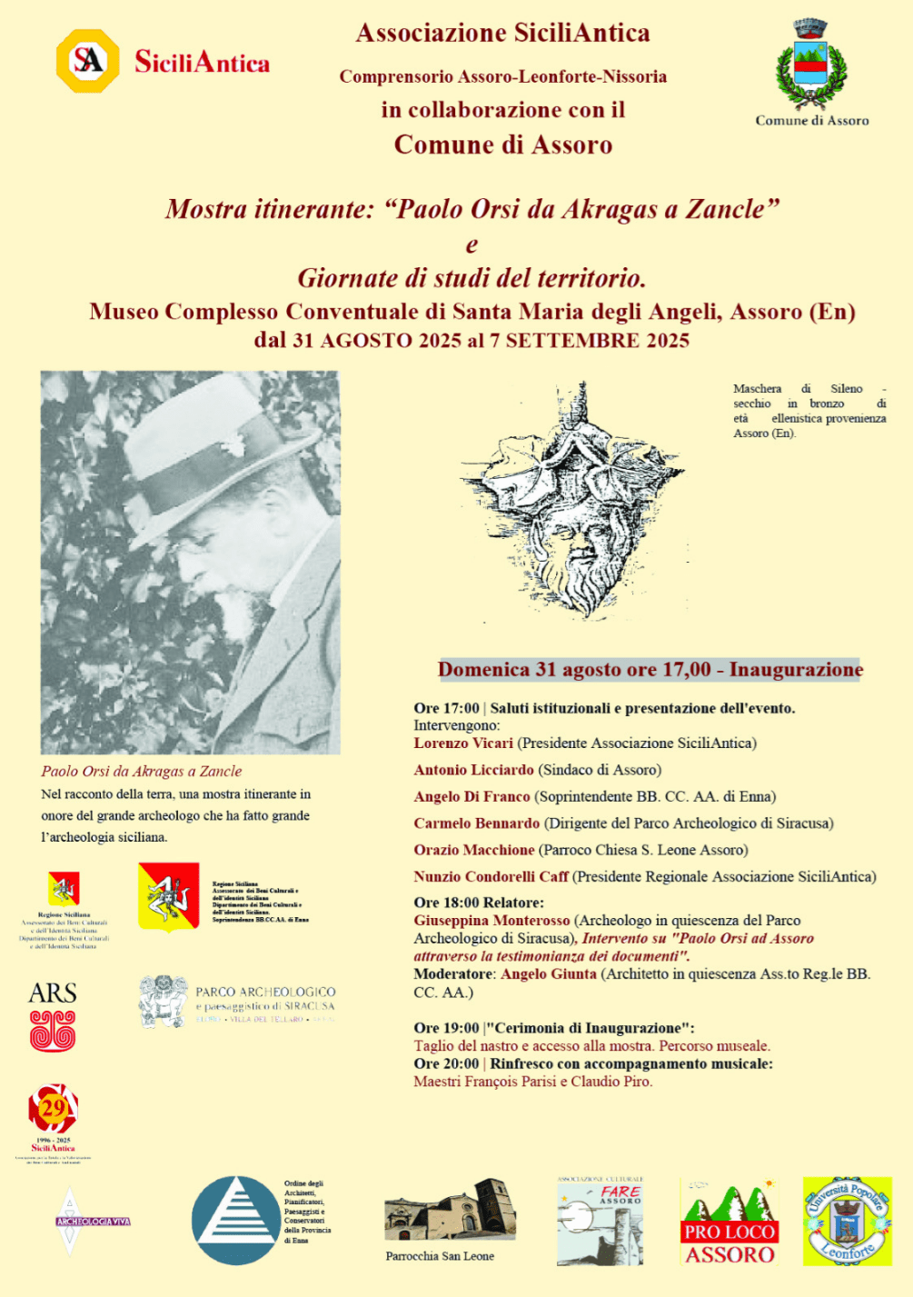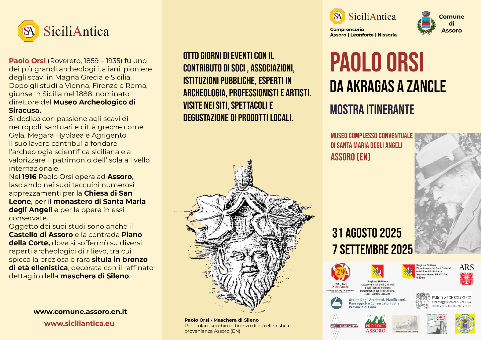 Dal 31 agosto al 7 settembre 2025, il Museo Complesso Conventuale di Santa Maria degli Angeli di Assoro ospita la mostra itinerante “Paolo Orsi da Akragas a Zancle”, promossa dall’Associazione SiciliAntica – Comprensorio Assoro-Leonforte-Nissoria, con il contributo del Comune di Assoro. L’iniziativa rende omaggio al grande archeologo siracusano e, soprattutto, diventa una vera e propria festa dell’archeologia, grazie all’impegno dei volontari che quotidianamente lavorano per la salvaguardia e la valorizzazione del territorio.