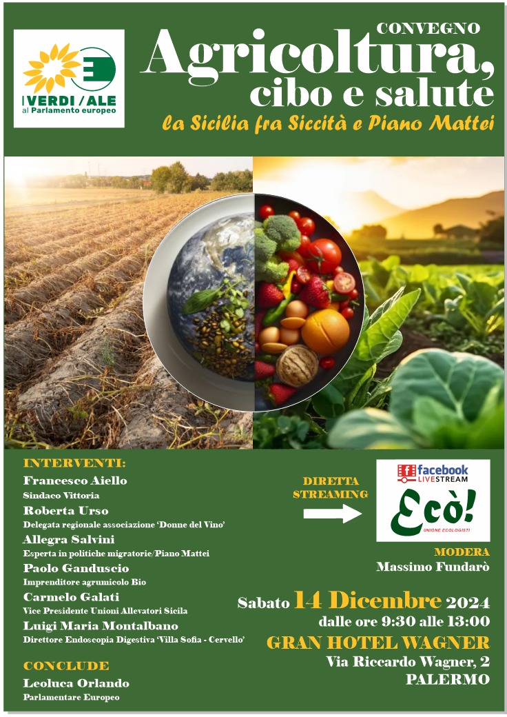 “Agricoltura, cibo e salute – La Sicilia fra siccità e Piano Mattei”: è il titolo del convegno organizzato dall’Associazione ambientalista Ecò in programma domani mattina, sabato 14 dicembre, a Palermo presso il Grand Hotel Wagner. Un incontro dedicato alla situazione dell’agricoltura siciliana con un focus sui problemi strutturali assieme a quelli legati al cambiamento climatico. “Abbiamo coinvolto diversi produttori siciliani – spiega Massimo Fundarò, presidente dell’associazione – con l’obiettivo di affrontare in maniera esaustiva e senza colore politico la condizione in cui versa il comparto produttivo siciliano. Se da una parte c’è un piccola eccellenza che resiste, dall’altra c’è un intero settore in gravissime difficoltà. Urge dunque agire e farlo presto per salvare l’economia siciliana”.
