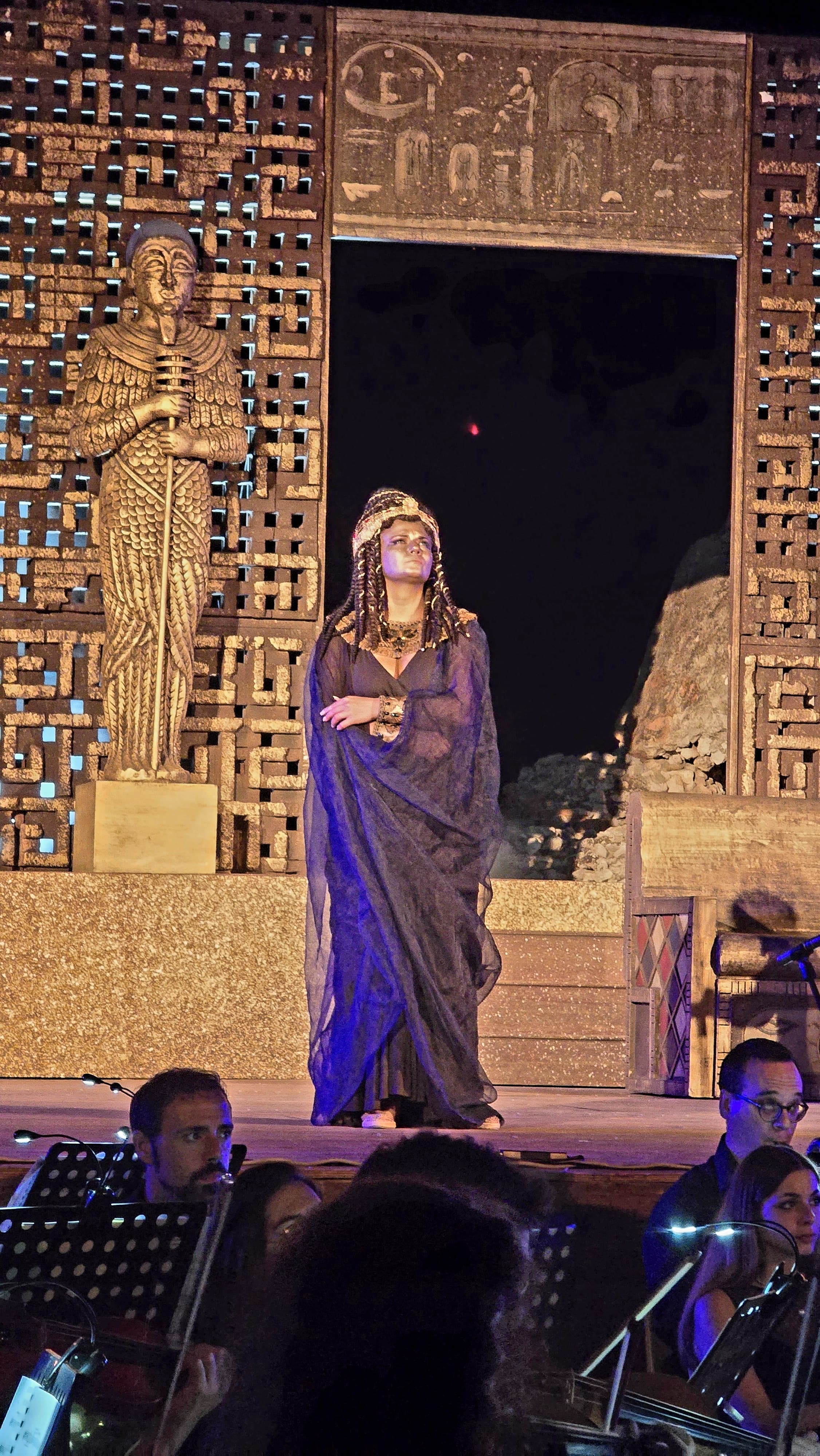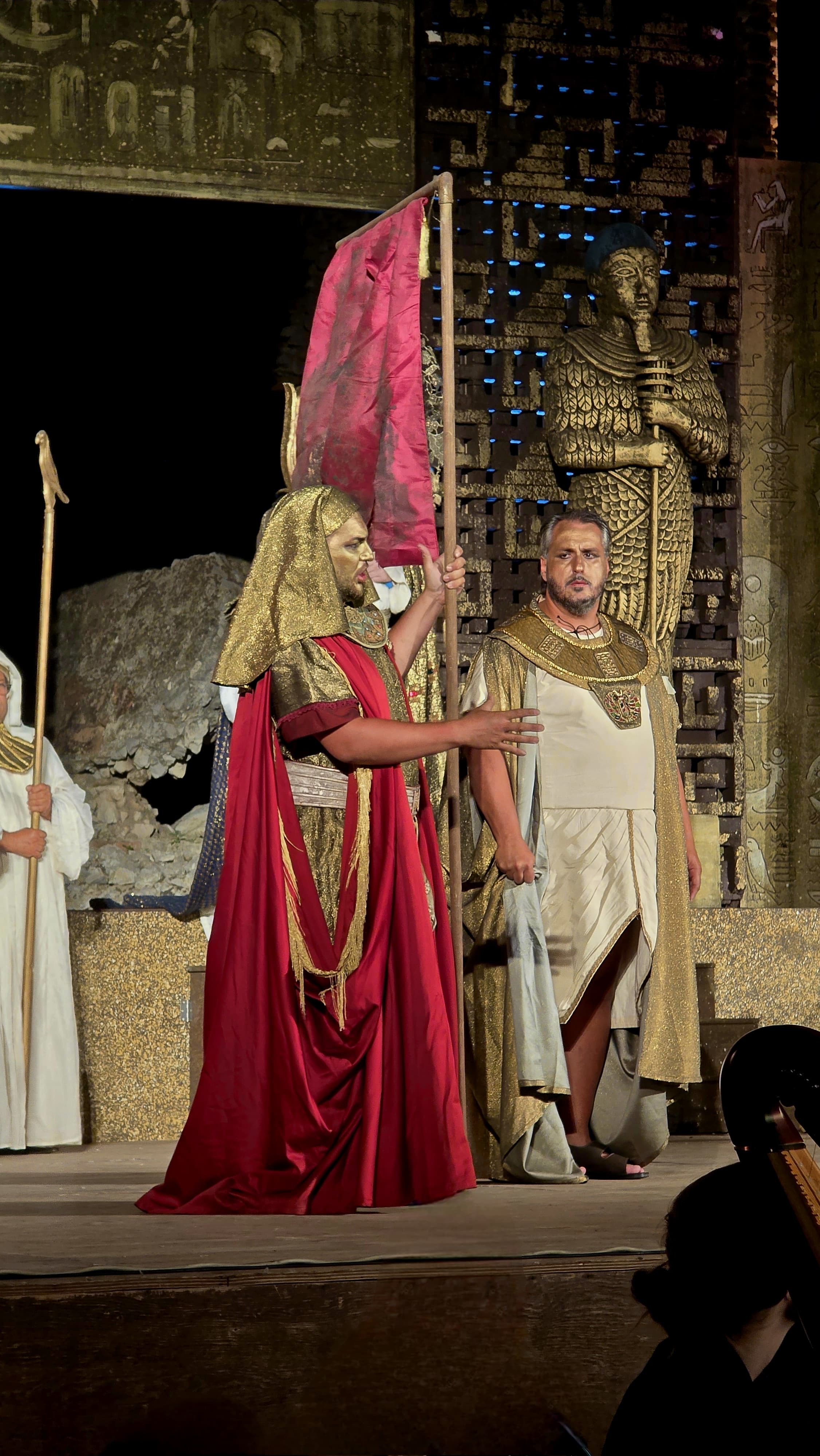 Al centro della scena, tre interpreti hanno acceso la notte taorminese. Mária Porubcinová ha restituito un’Aida dolente e raffinata, segnata da un canto luminoso e pieno di sfumature che ha commosso la platea. Alberto Profeta, nel ruolo di Radamès, ha riempito il teatro con uno squillo sicuro e generoso, incarnando l’eroe diviso tra patria e amore. Accanto a loro, l’Amneris di Chinara Shirinova si è imposta con la sua forza scenica e vocale, vibrante di passione e gelosia: applausi e ovazioni hanno accompagnato la sua interpretazione, tra le più applaudite della serata. Non meno determinanti i contributi di Paolo Battaglia, Angelo Sapienza, Jung Jaehong, Francesco Ciprí e Maria Giorgia Caccamo, che hanno dato compattezza e valore al cast.
